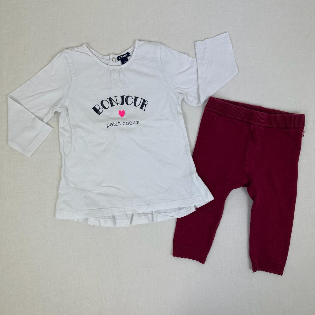 Autres commentaires : 1% elasthanne.Legging Obaibi bordeaux avec taille élastiquée. T-shirt manches longues Kiabi blanc avec motif bonjour et une fermeture par boutons pressions au dos.Contient quelques bouloches d’usage.