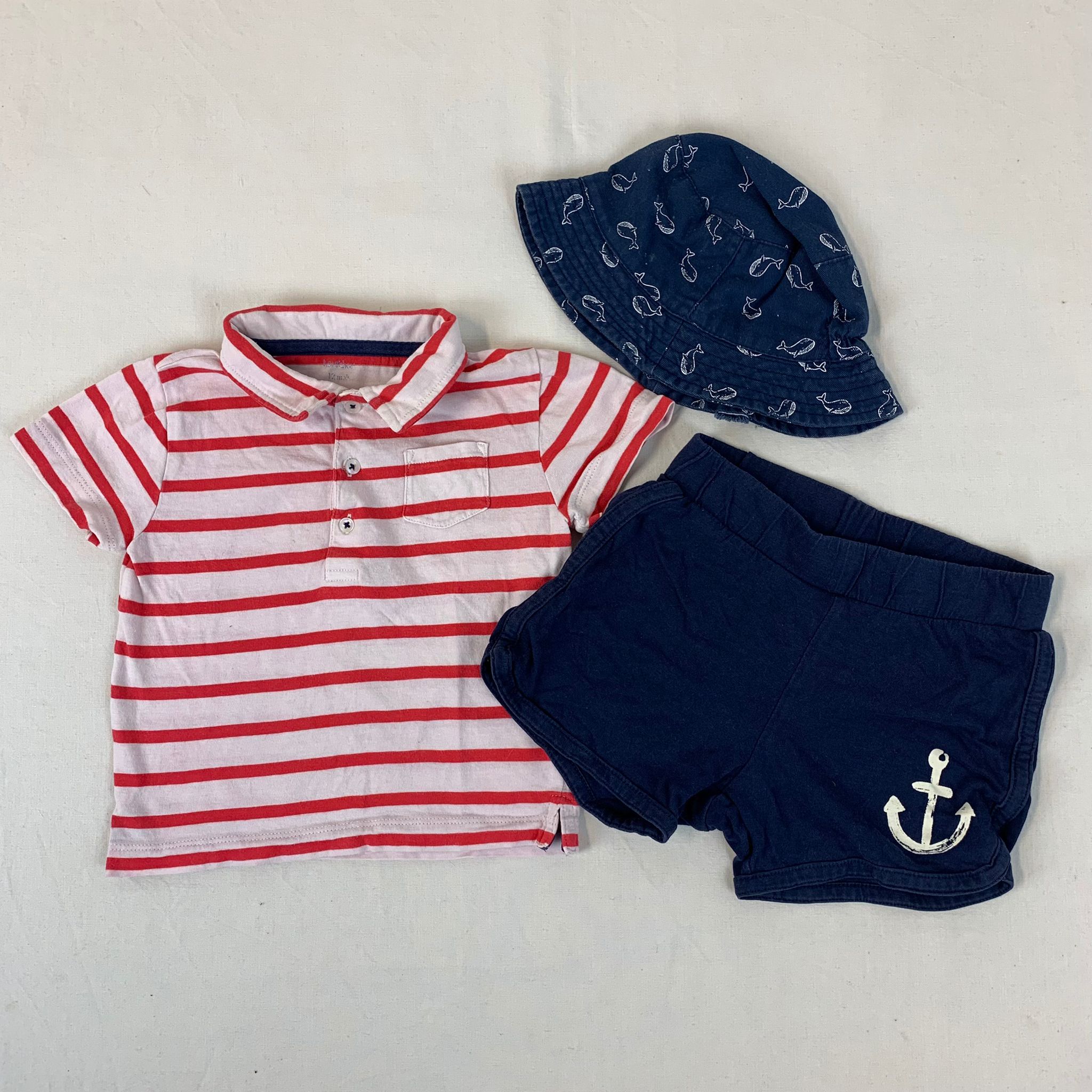 Autres commentaires : Polo blanc manches courtes avec des rayures rouges. Short bleu avec taille élastiquée et Bob bleu offert.