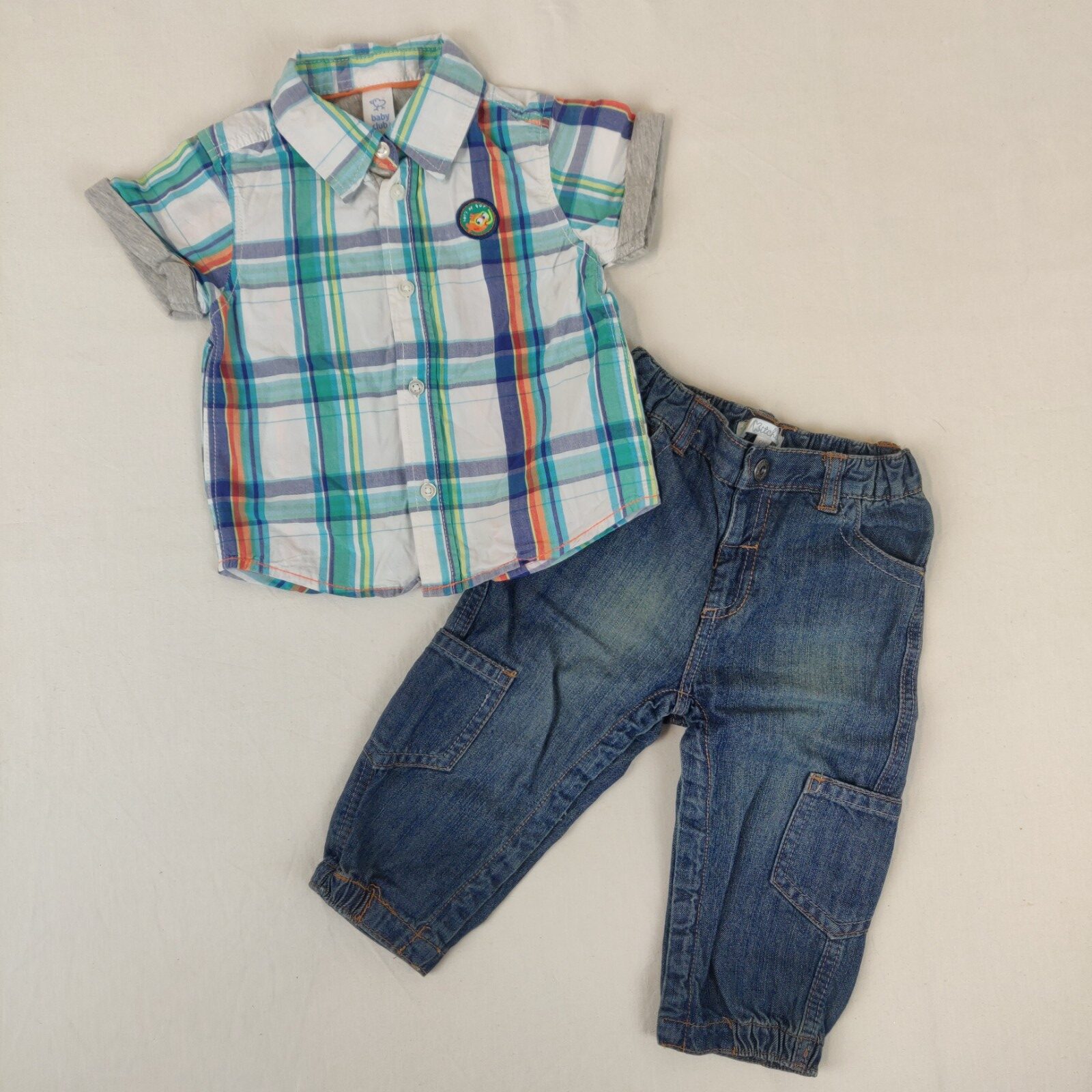 Autres commentaires : Ensemble 2 pièces. Une chemise à manches courtes C&A – blanc à motif écossais bleu, jaune, vert, orange et bleu marine. Petit écusson central représentant un poisson. Ouverture centrale à boutons. Un jean Kitchoun en denim bleu. Taille élastique. 2 poches latérales et 2 poches arrières. Passants pour une ceinture. Marques d’usure au niveau des jambes.