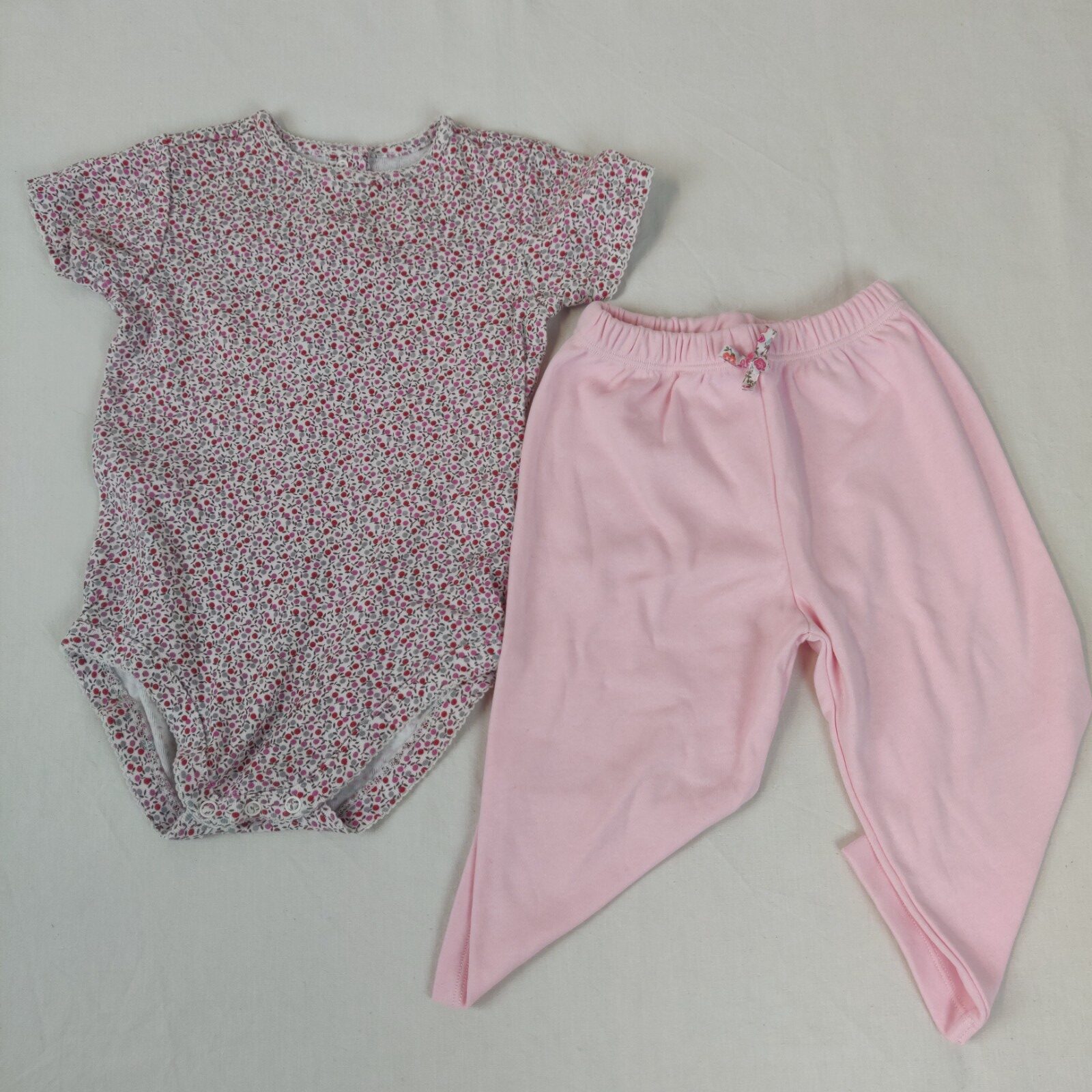Autres commentaires : Ensemble 2 pièces. Un body à manches courtes – blanc à fins motifs floraux. Ouverture centrale au dos à 3 pressions. Un pantalon de jogging sans marque – rose. Taille élastique ornée d’un noeud central en tissu à fleurs.