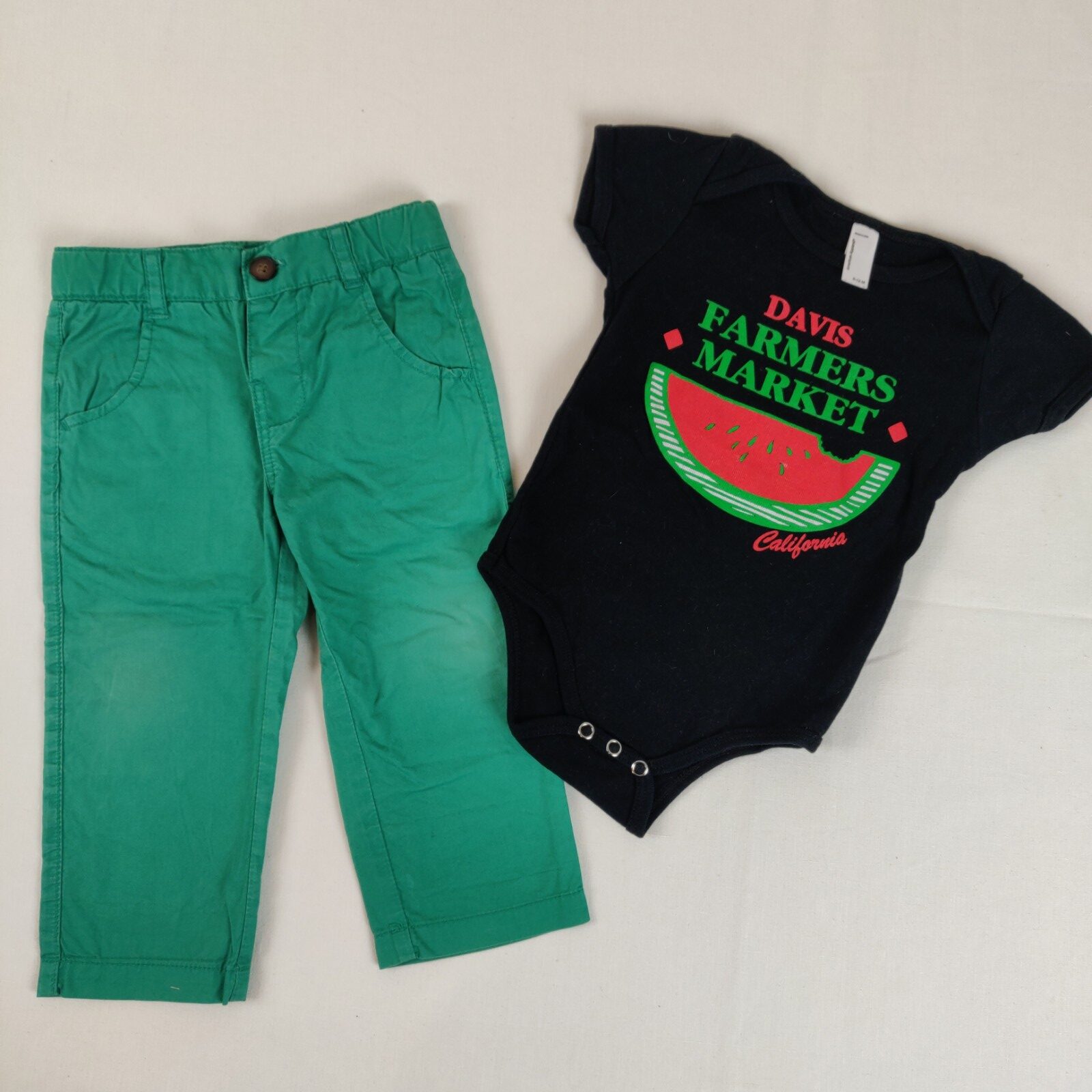 Autres commentaires : Ensemble 2 pièces. Un body à manches courtes American apparel – noir avec motif central rouge et vert pastèque accompagné de l’inscription  » Davis Farmers Market. California ». Un pantalon Bout’chou – vert. Taille sans élastique. 2 poches latérales et 2 poches arrières. Passants pour une ceinture.