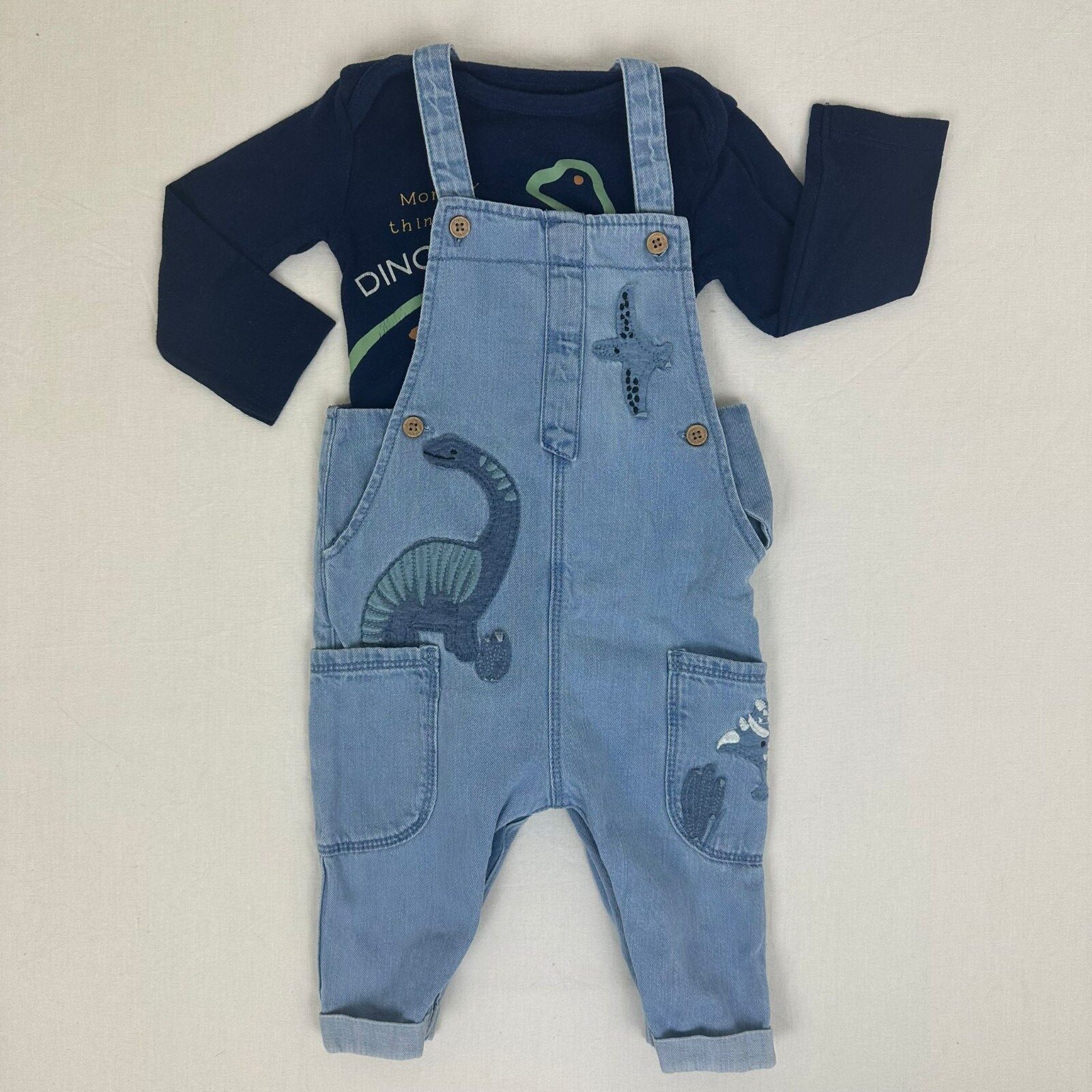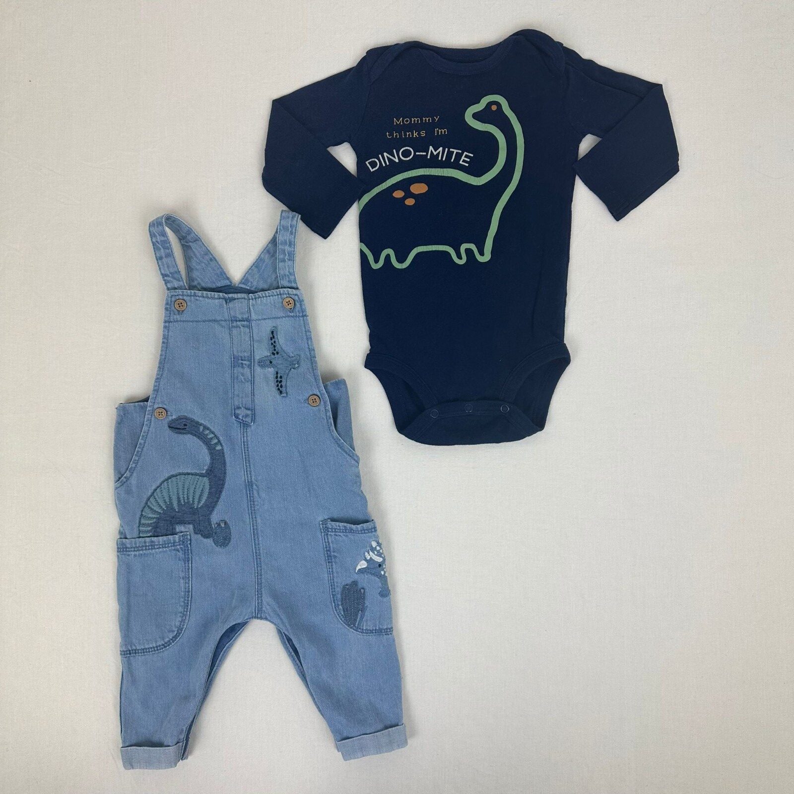 Autres commentaires : Body Carter’s bleu manches longues. Salopette en jean Next Baby bleu avec motif dinausor.
