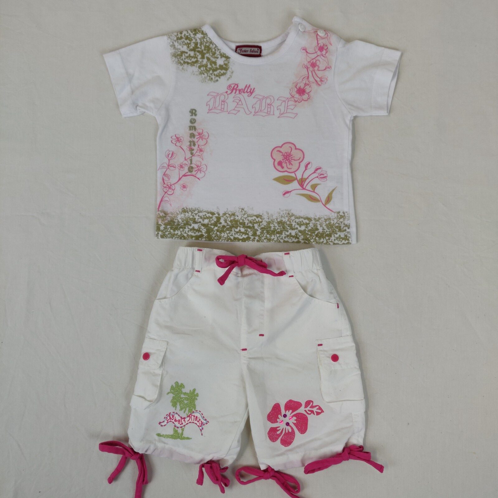 Autres commentaires : 35% coton. T-shirt à manches courtes Foster Babies – blanc avec des motifs floraux roses et marrons accompagnés de l’inscription rose « Pretty babe romantic ». Lègère tâche marron clair au niveau du rebord du col. Bermuda Tom&Riddy – blanc avec motifs floraux roses et verts. Taille élastique avec cordon interne rose. 2 poches latérales, 2 poches à rabat. Possibilité de serrer l’ouverture des jambes à l’aide d’un cordon rose.