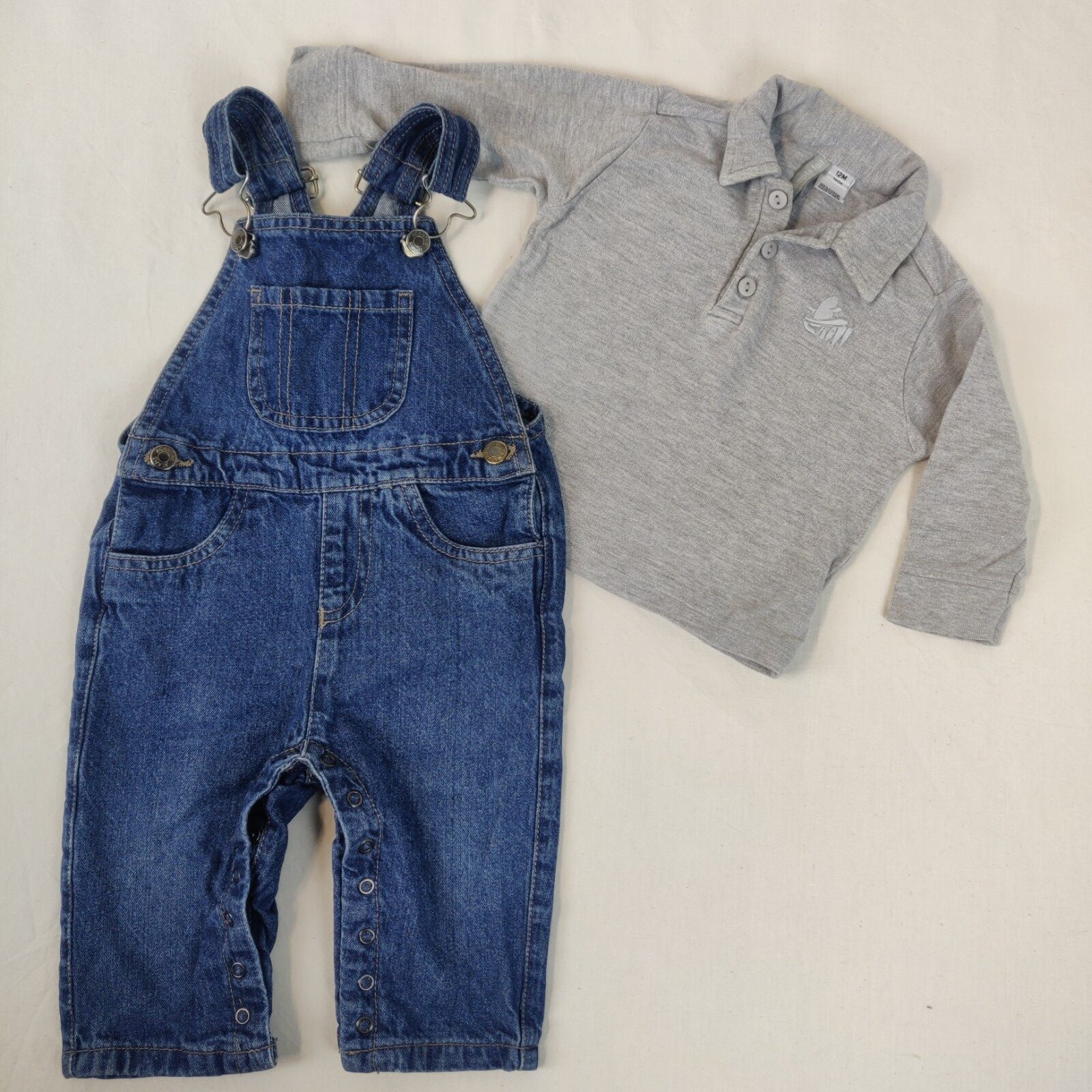 Autres commentaires : Ensemble 2 pièces. Un polo Tout compte fait à manches longues – gris chiné. Une salopette Acanthe en denim – bleu. Boucles salopette réglables. Une pochette centrale. 2 poches latérales et 2 poches arrières. Ouverture à l’entrejambe à pressions.