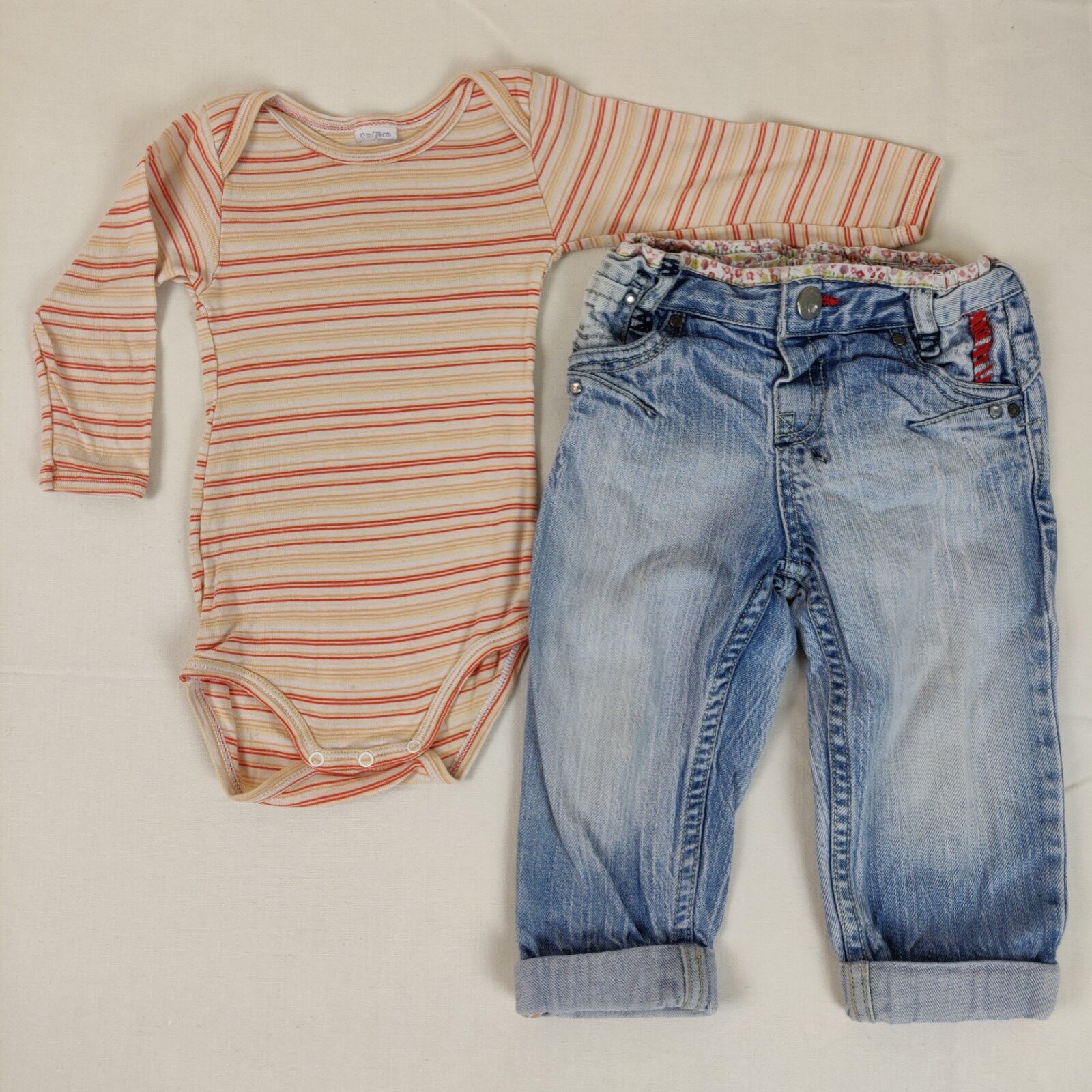 Autres commentaires : Ensemble 2 pièces. Body « Petit Bateau » à manches longues – écru avec de fines rayures rouges, oranges, saumons, roses et jaunes. Discrète tâche bleue à l’arrière du body. Jean « Zara Baby » – bleu clair – effet used. Taille ajustable. Ouverture centrale à un bouton pression. 2 poches latérales ornées de rivets et de strass. 2 poches arrières. Les chevilles sont retroussées. Passants pour une ceinture.
