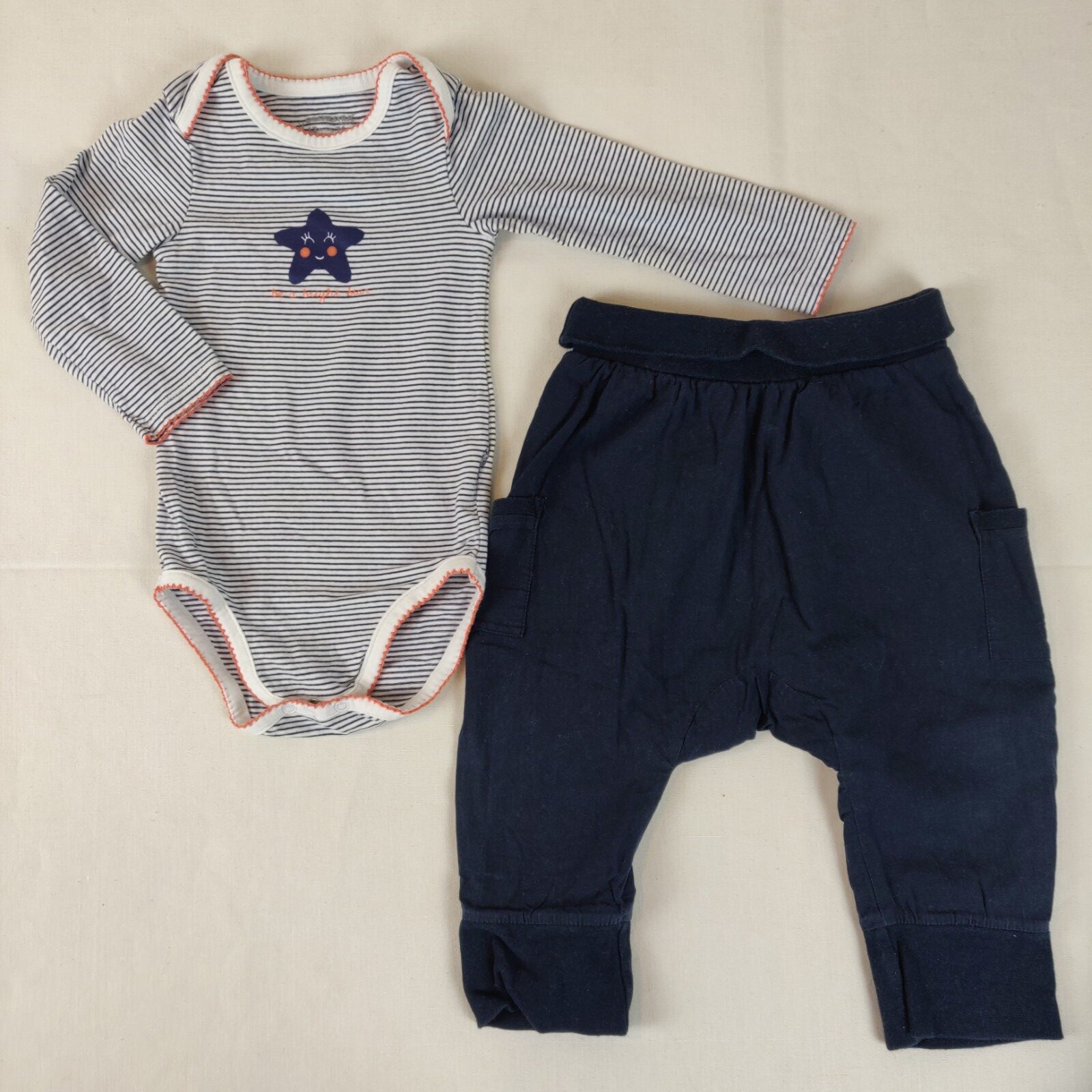 Autres commentaires : Un body Orchestra – écru – avec lignes horizontales bleues. Motif central étoile. Fermeture entre-jambe à trois pressions. Pantalon Bout’chou – bleu marine – avec taille et chevilles élastiques façon tricot. 2 poches latérales.