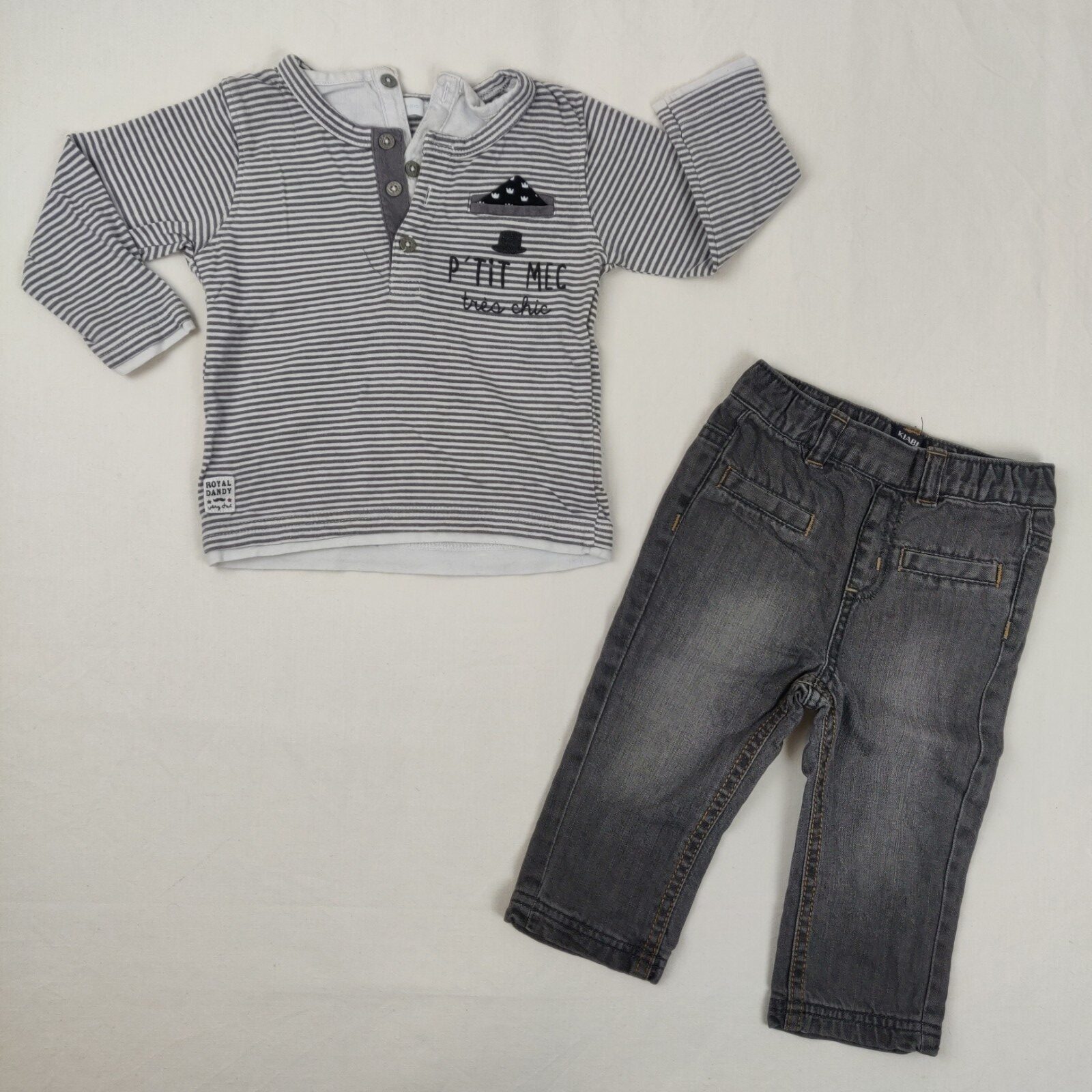 Autres commentaires : T-shirt manches longues gris avec rayures beige et une fermeture au col par boutons. Jegging Kiabi marron avec taille élastiquée.