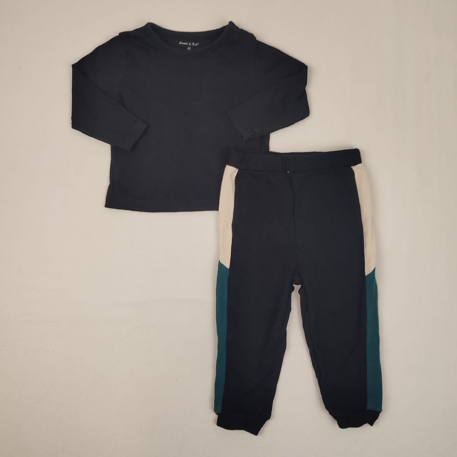 Autres commentaires : Ensemble 2 pièces : – T-shirt Sweet & Soft uni noir à manches longues, fermeture par 2 boutons pression à l’épaule gauche, col rond. – Pantalon de jogging SHEIN noir, bande blanche et turquoise sur les côtés, taille élastiquée.