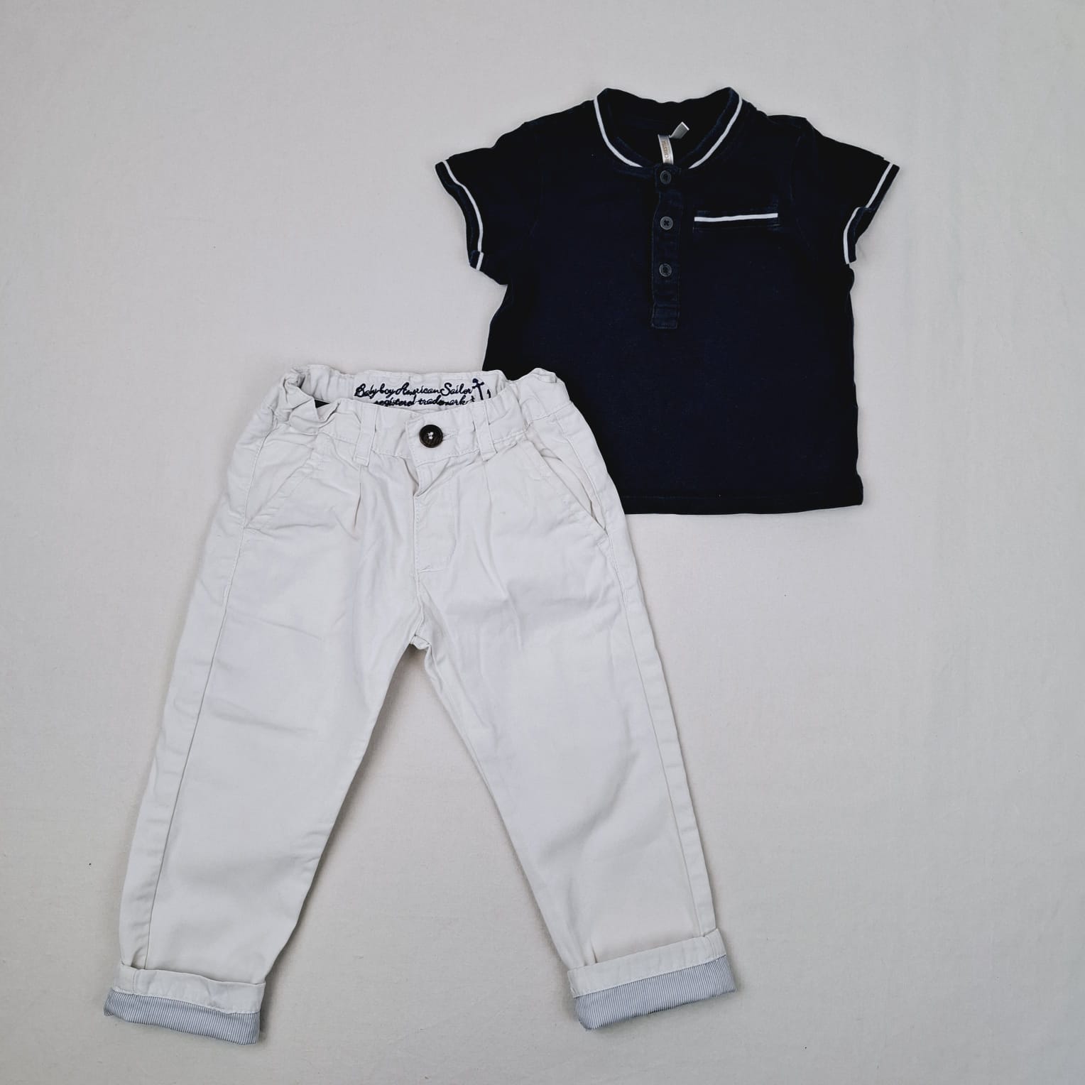 Autres commentaires : Ensemble 2 pièces : -T-shirt manches courtes bleu foncé, Orchestra, col rond avec boutons pour l’ouvrir, petite poche à l’avant du vêtement. -Pantalon blanc, Zara, taille élastiquée, avec élastique pour régler la taille.