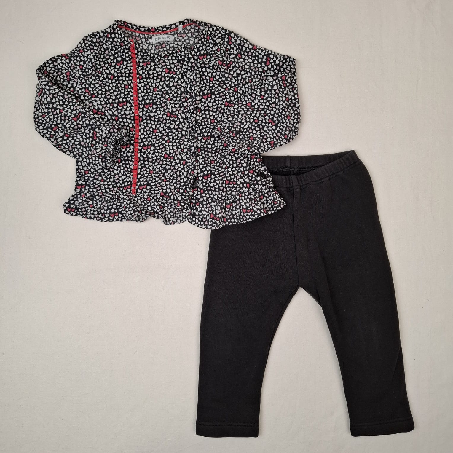 Autres commentaires : Ensemble 2 pièces : – Blouse IKKS noire à manches longues, imprimé mini coeurs blancs et roses et mini têtes de mort blanches, fermeture devant par zip avec rabat volanté, col rond, poignets élastiqués, 100% viscose. – Jegging noir uni Uniqlo, taille élastiquée, 52% coton, 42% coton, 6% élasthanne.