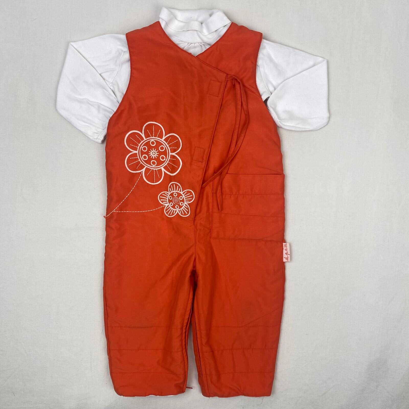 Autres commentaires : Ensemble 2 pièces : – T-shirt TEX à manches longues blanc uni, col roulé. – Combinaison DPAM à bretelles orange avec des motifs de fleurs brodés, fermeture par lanières, scratch et zip. Contient du polyester.