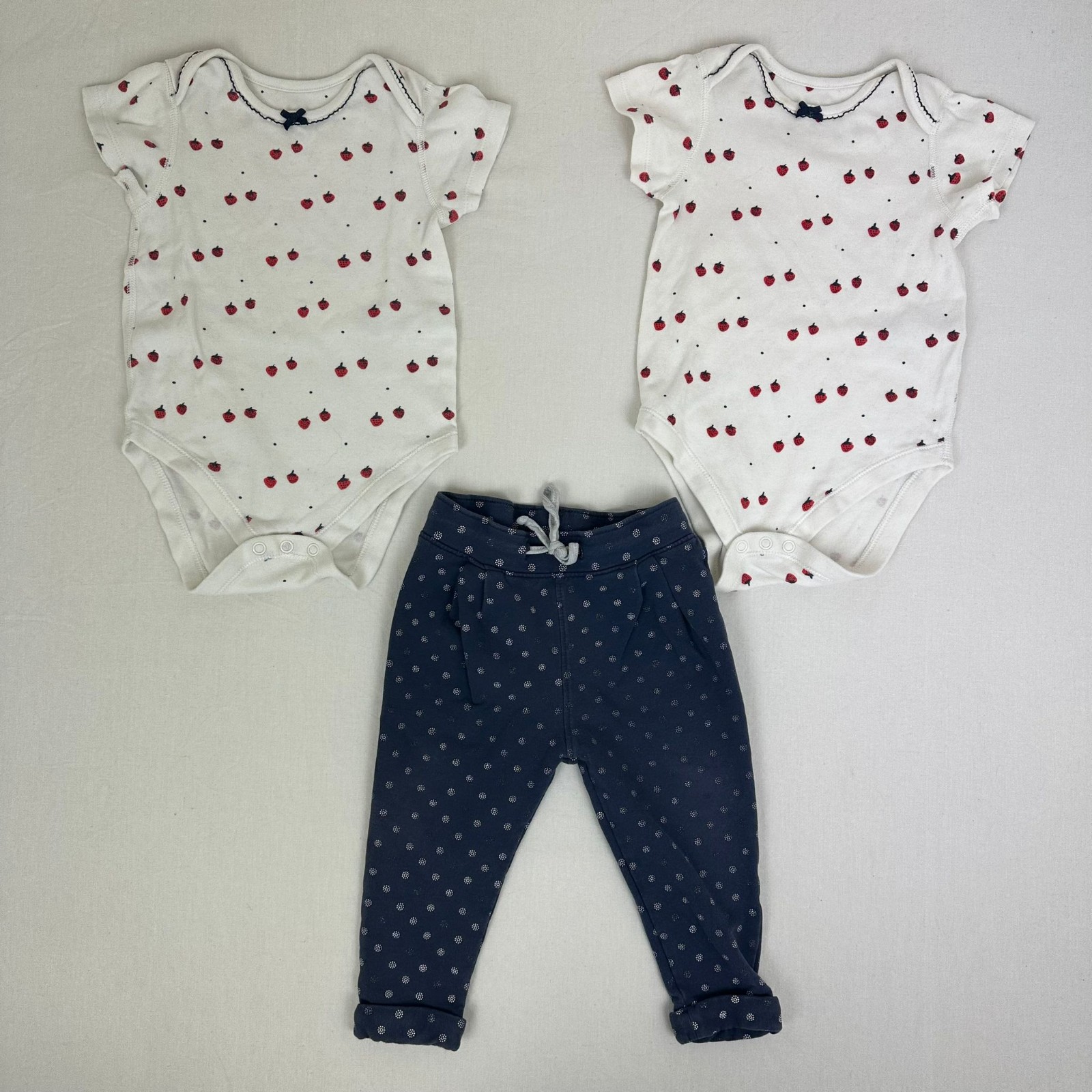 Autres commentaires : 2 bodies M&S blanc avec motif de fraise rouge et bleu. Jogging bleu Obaibi avec motif blanc dessous.