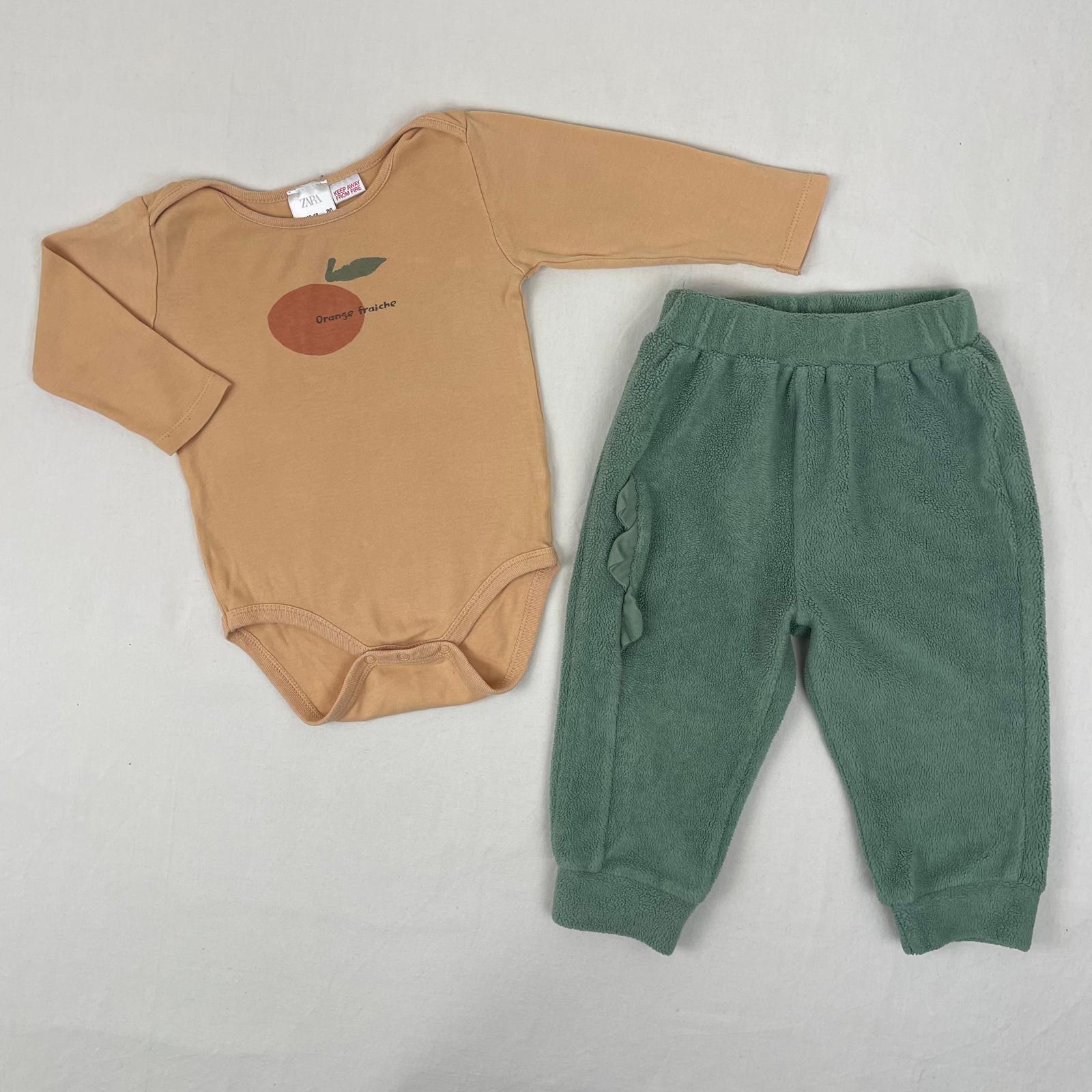 Ensemble : body orange à manches longues 100 % coton avec dessin d’orange, et pantalon vert en matière pilou-pilou.