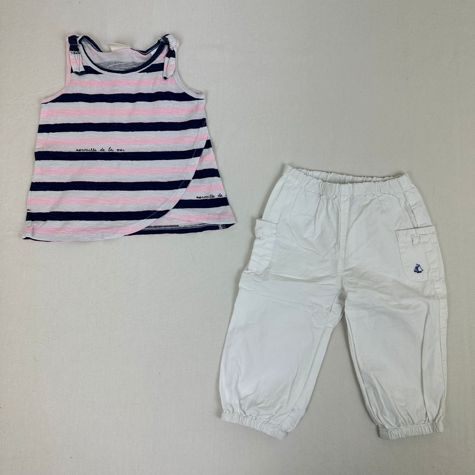 Autres commentaires : Pantalon blanc Petit Bateau avec taille élastiquée. T-shirt Zara sans manches gris, bleu et rose à rayures.