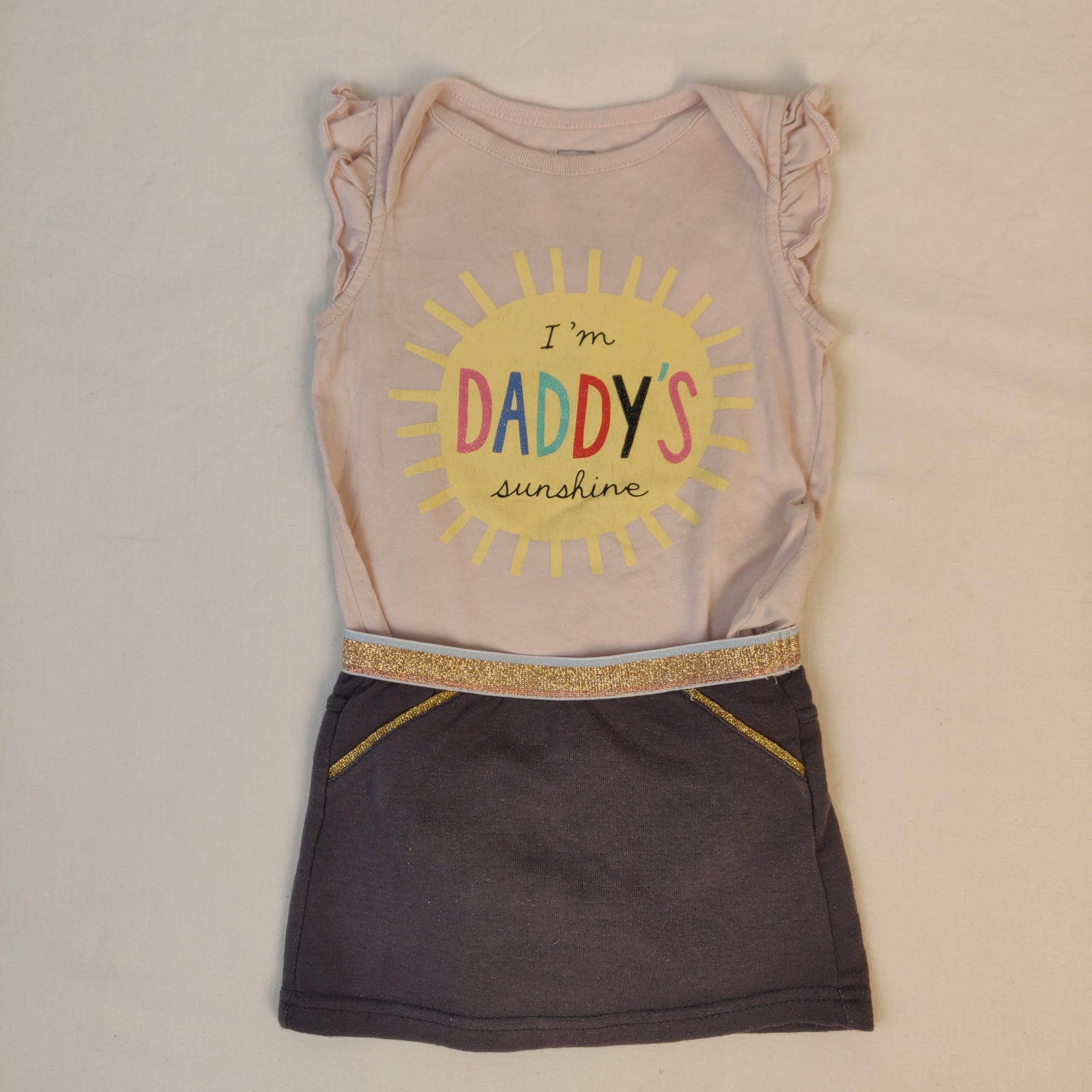 - Body sans manches volanté, rose poudré, avec soleil et inscription « I’m Daddy’s sunshine »