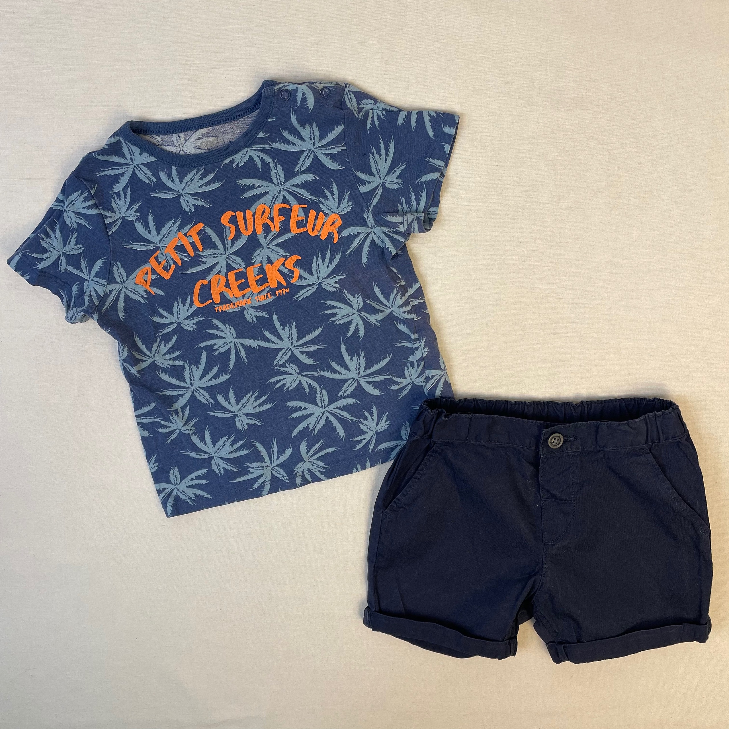 - t-shirt bleu avec des palmier bleu clair et l’écrito ‘petit surfeur creeks » en orange au centre.