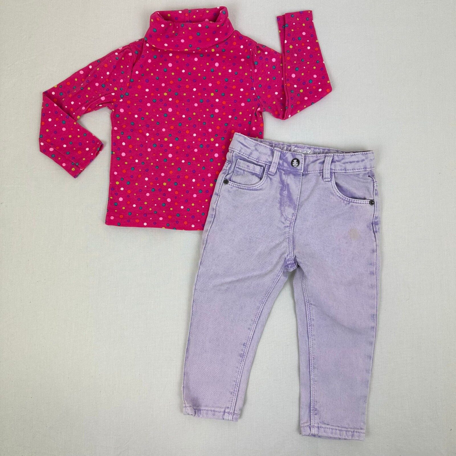 Autres commentaires : Jean Lulu castagnette violet. T-shirt rose Garanimals col roulé avec des cercles mulicolores.