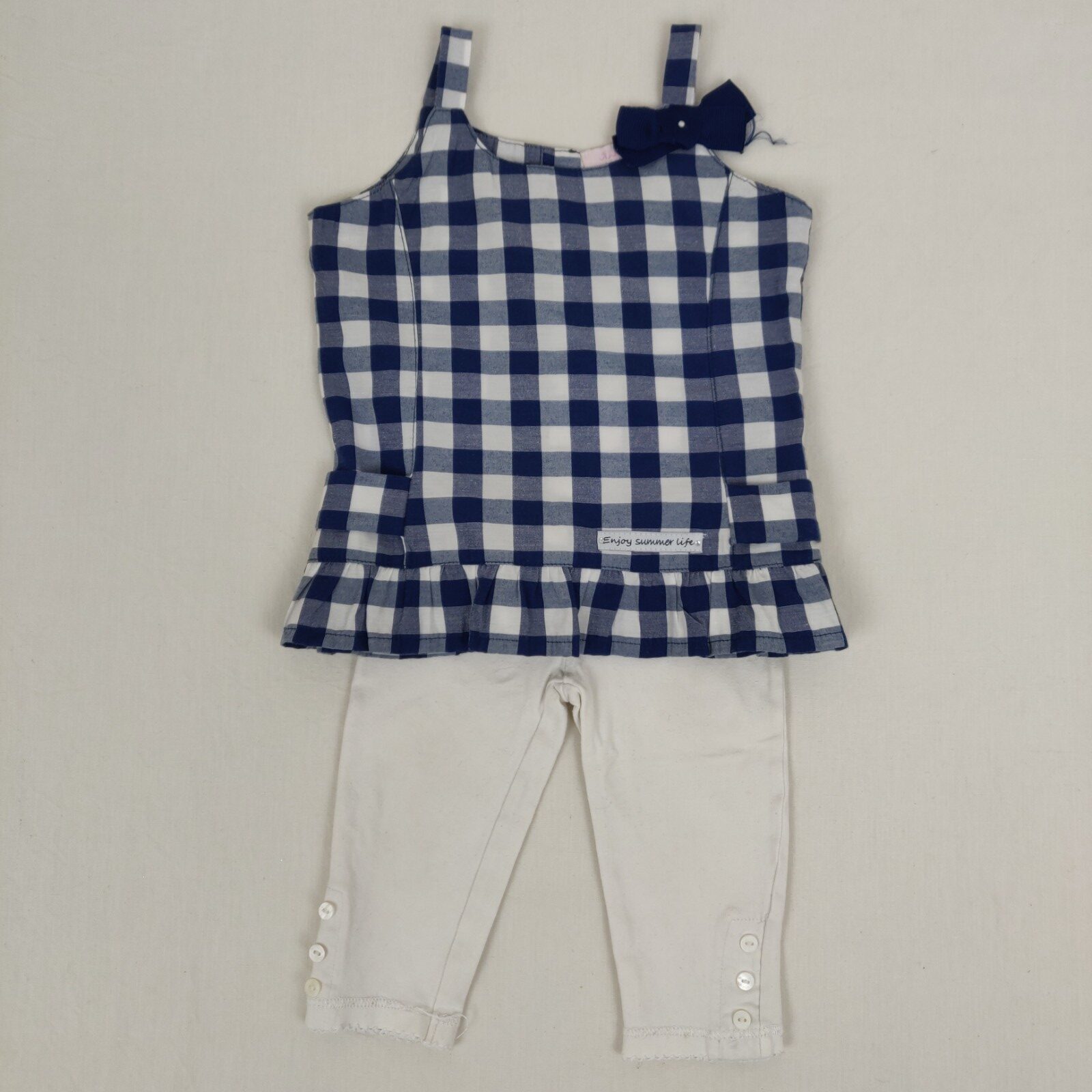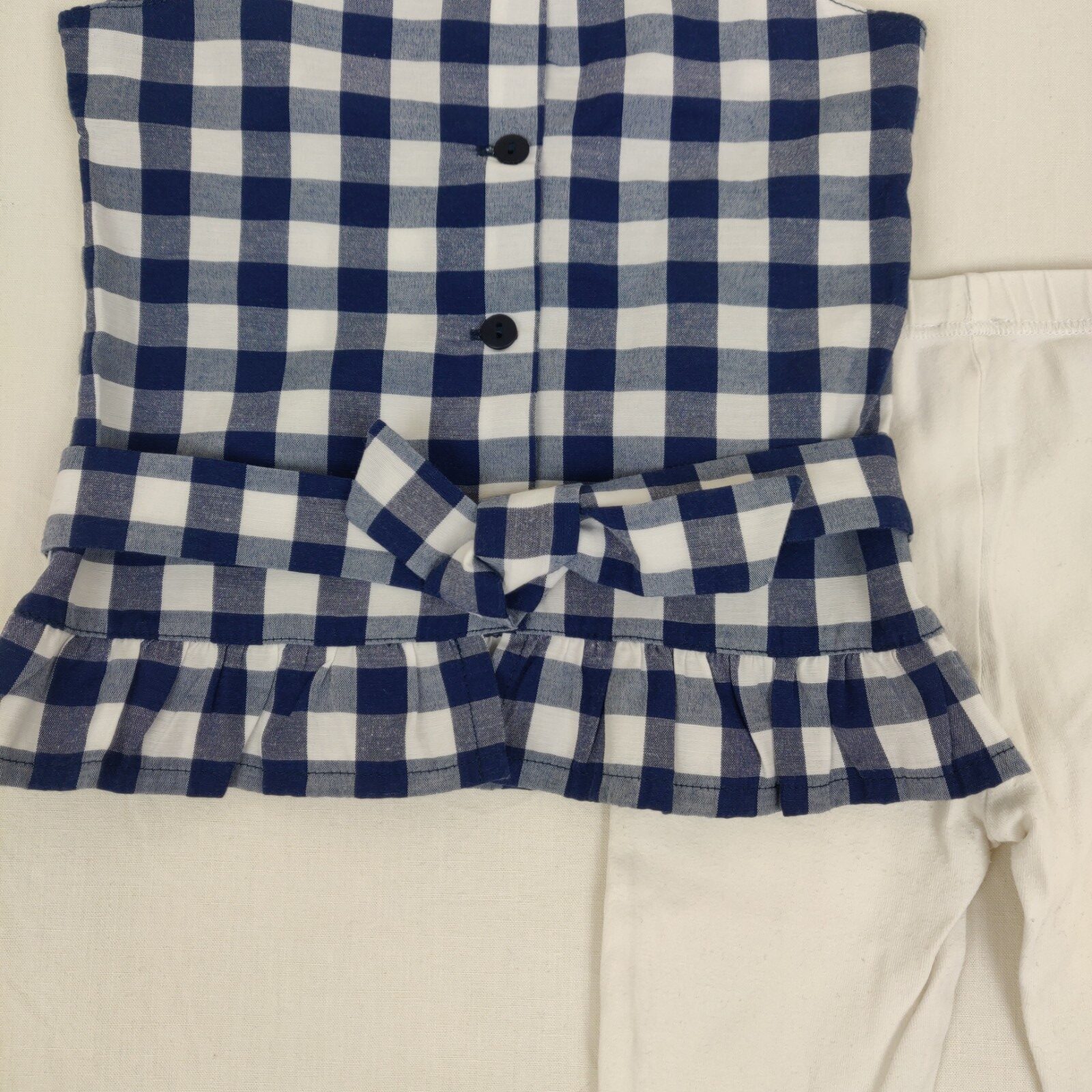 Autres commentaires : 40% polyester : chemisier à bretelles bleu marine et blanc à carreaux. 5%elasthanne : legging Cyrillus blanc avec une petite tâche marron à l’arrière.