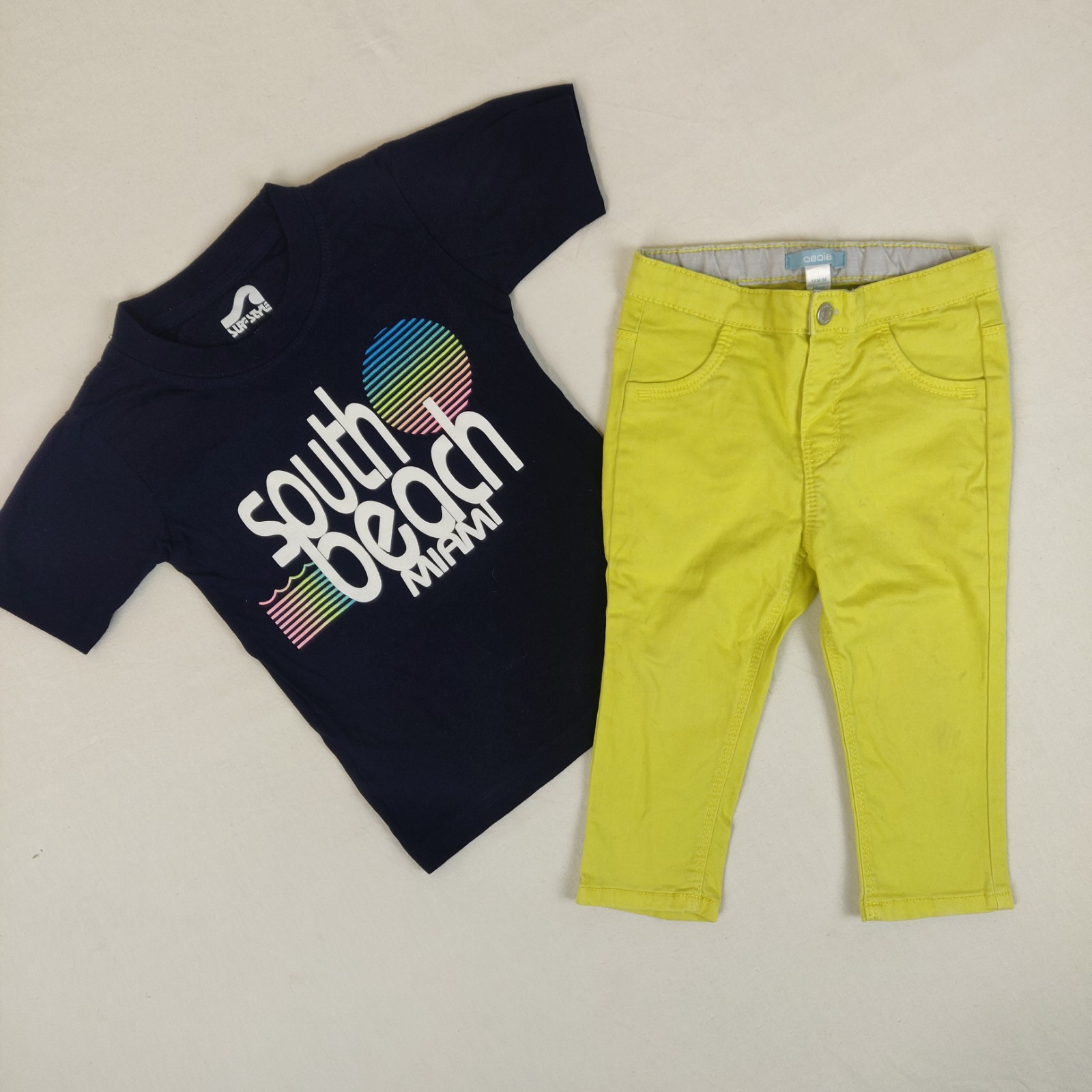 Autres commentaires : Pantalon en denim jaune/vert, contient 2% d’élasthanne, quelques tâches discrètes à la jambe gauche. T-shirt bleu foncés manches courtes avec un dessin blanc au milieu