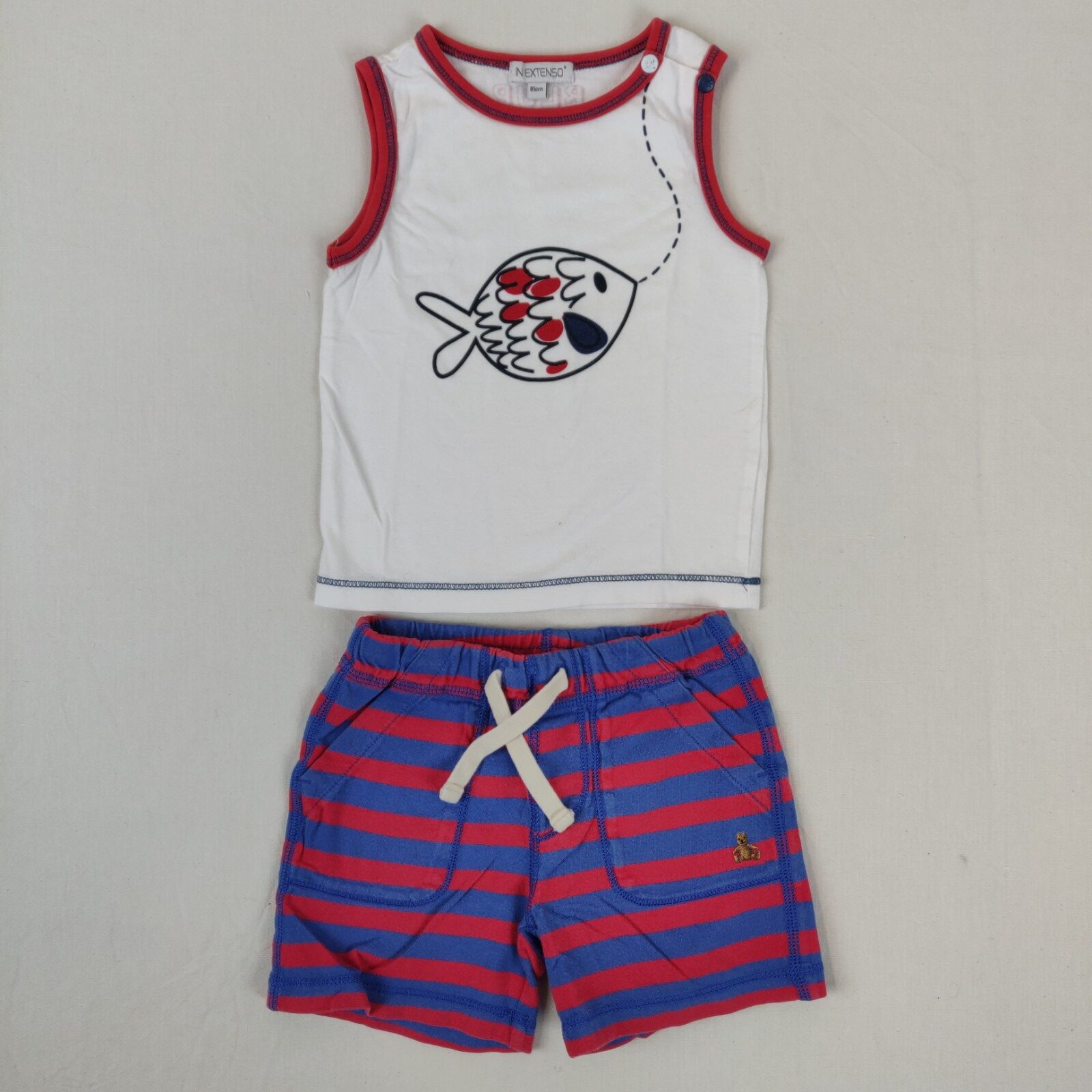 Autres commentaires : Ensemble 2 pièces. Un débardeur In extenso – blanc à motif central poisson. Ouverture latérale à 2 pressions. Un short Gap rayé bleu et rouge. Taille élastique avec cordon interne blanc. 2 poches latérales dont une avec un petit ourson brun cousu. Usure normale.