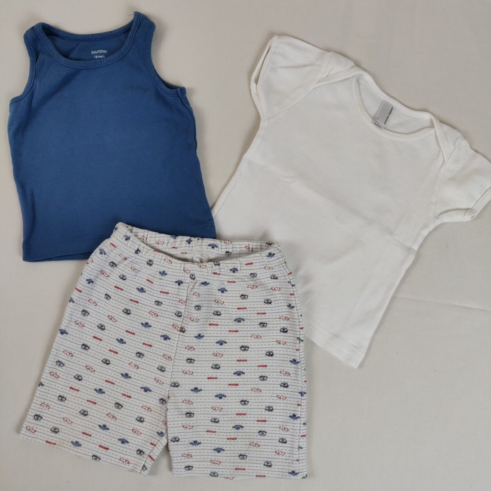 Autres commentaires : Ensemble 2 pièces. Un débardeur Bout’chou – bleu-gris. Un bermuda sans marque – écru avec de fines rayures bleu-gris et des fins motifs variés rouges et bleus. Taille élastique. Un t-shirt à manches courtes American apparel blanc offert.