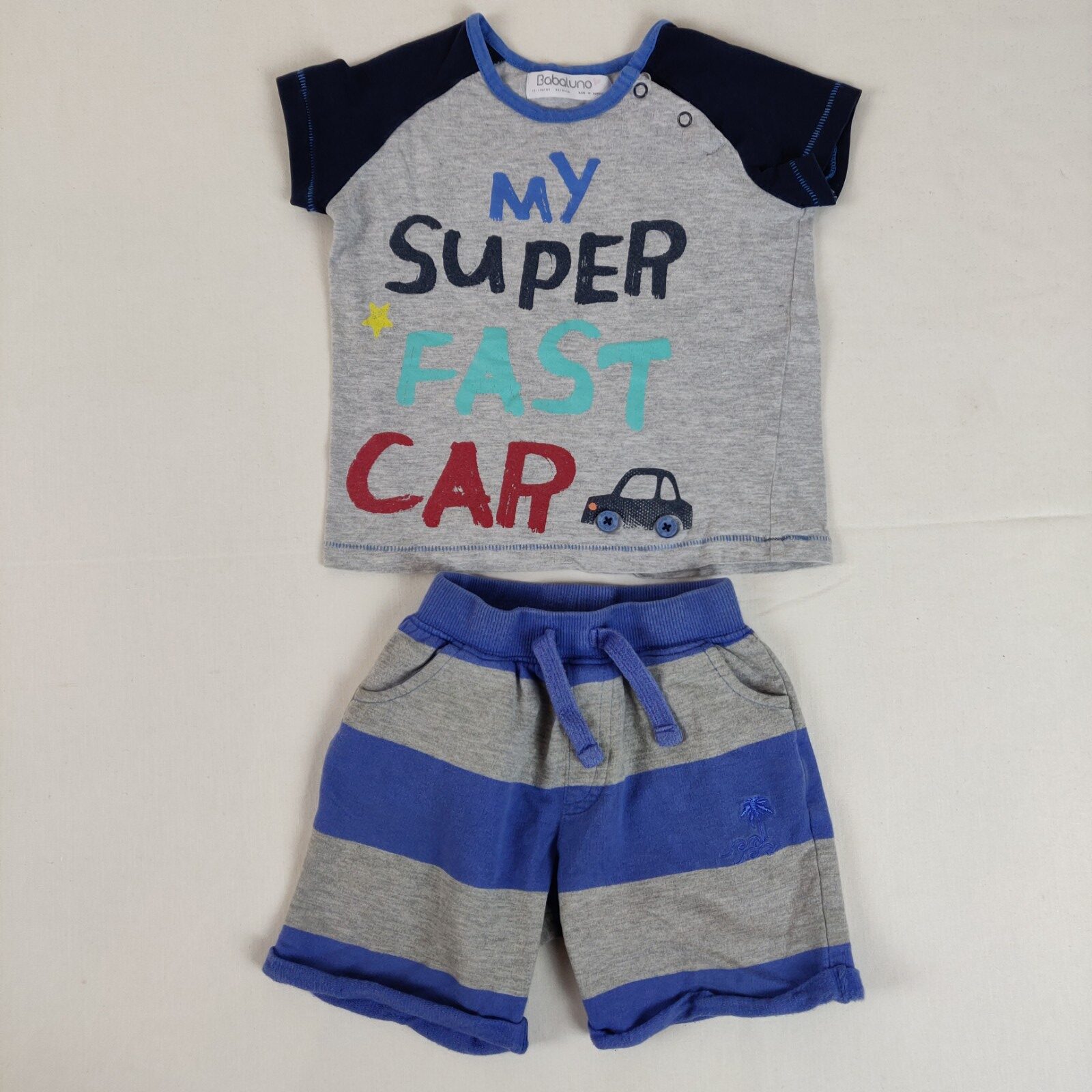 Autres commentaires : Ensemble 2 pièces. T-shirt à manches courtes Babaluno – gris clair chiné avec les manches bleu marine. Motif central voiture grise accompagné de l’inscription multicolore « My super fast car ». Ouverture latérale à 2 pressions. Bermuda Nutmgeg rayé gris chiné et bleu. Taille élastique avec cordon bleu. 2 poches latérales et une poche arrière bleue. Usure normale des vêtements.
