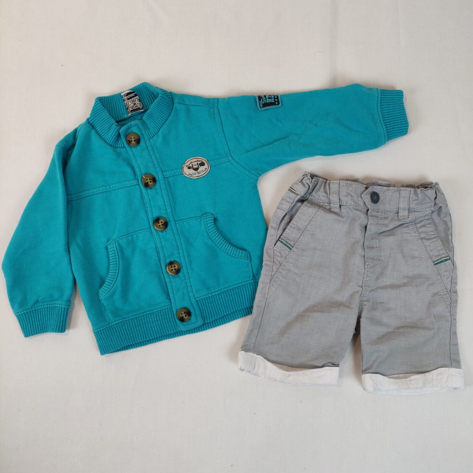 Autres commentaires : 20% polyester, 2% élasthanne. Bermuda Obaïbi – gris clair à pointillés gris foncé – ouverture centrale à un bouton pression, 2 poches latérales et 2 poches arrières, ouvertures jambes retroussées. Passants pour une ceinture. Gilet Tape à l’oeil – bleu – ouverture centrale à boutons classiques. 2 poches latérales.