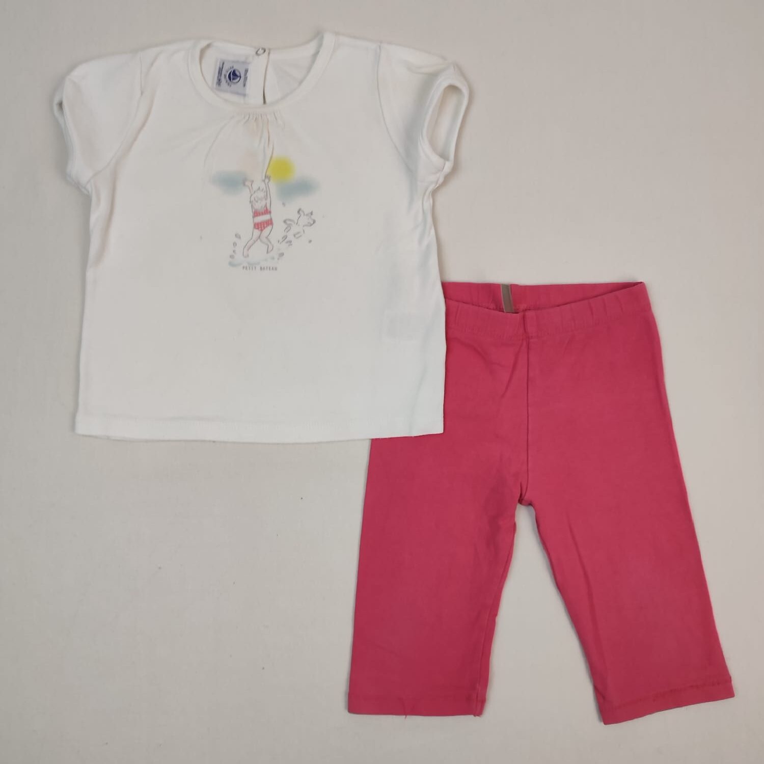 Autres commentaires : Ensemble 2 pièces : – Leggings rose Orchestra, 95% coton et 5% elasthanne. – T-shirt manches courtes blanc Petit bateau, motif petite fille en maillot de bain avec chien, col rond un peu froncé, fermeture par 1 bouton pression en haut du dos, 100% coton. Petite tache au niveau des fronces du t-shirt. Niveau réduit de Fraise à Myrtille.
