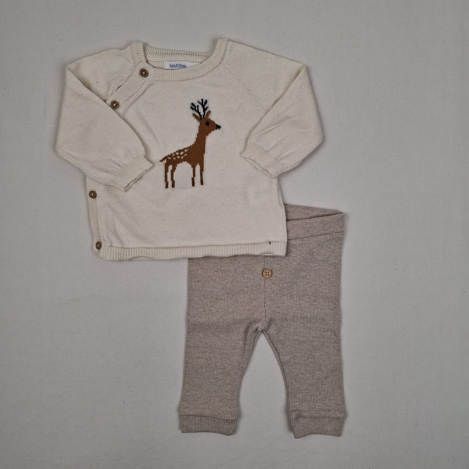 Autres commentaires : Ensemble 2 pièce: -Pull crème tricoté BOUT’CHOU, motif cerf, fermeture par boutons, col rond, bordures côtelées, 89% coton, 11% cachemir. -leggings beige côtelé.