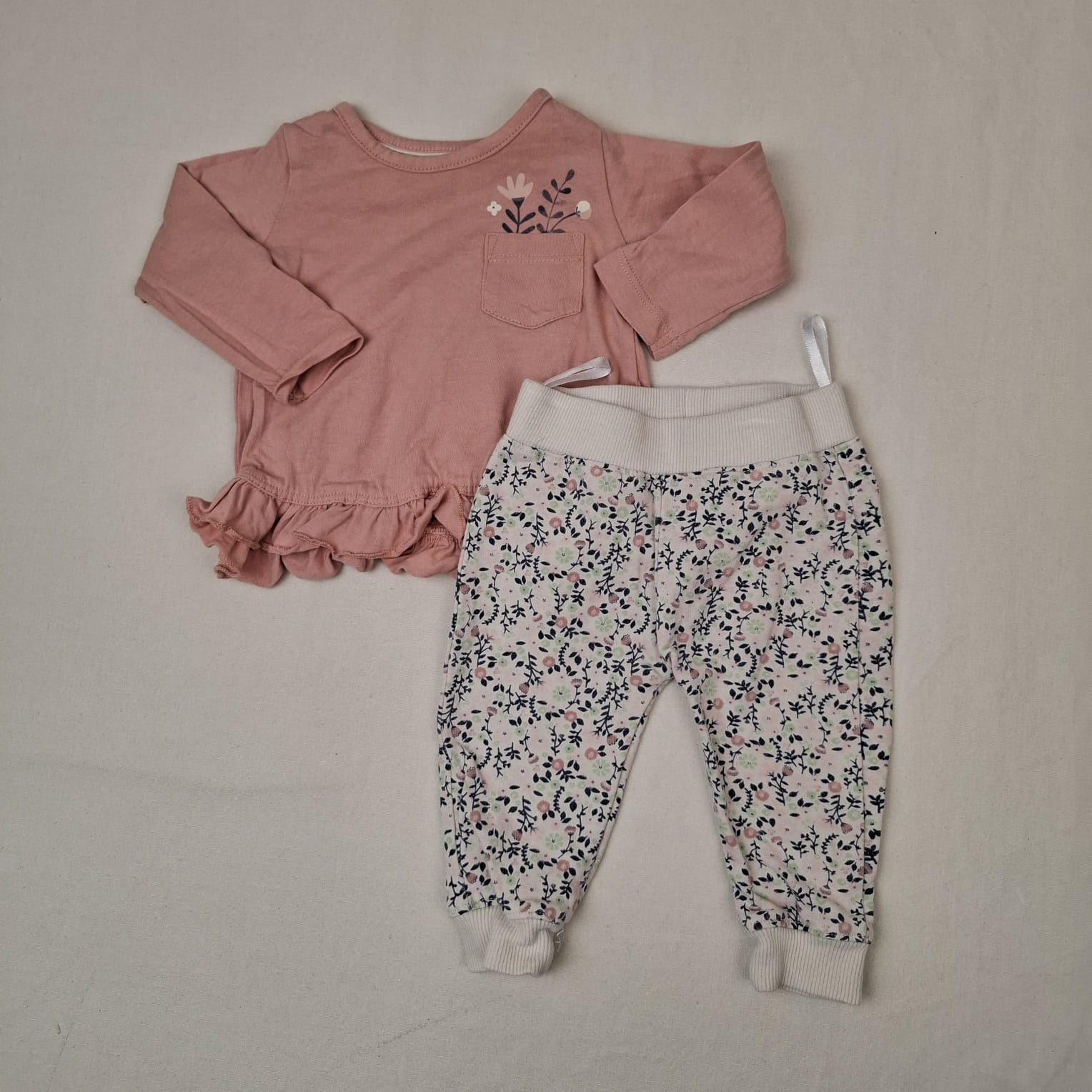 Autres commentaires : Ensemble 2 pièces : – un t-shirt manches longues rose pêche LUPILU, volanté en bas , devant motif foral au niveau de la poche, fermeture par boutons pression à l’épaule gauche. – Un pantalon de jogging Zeeman écru parsemé de petites fleurs bleu foncé, roses et vertes, taille et chevilles élastiquées et côtelées, 95% coton et 5% élasthanne.