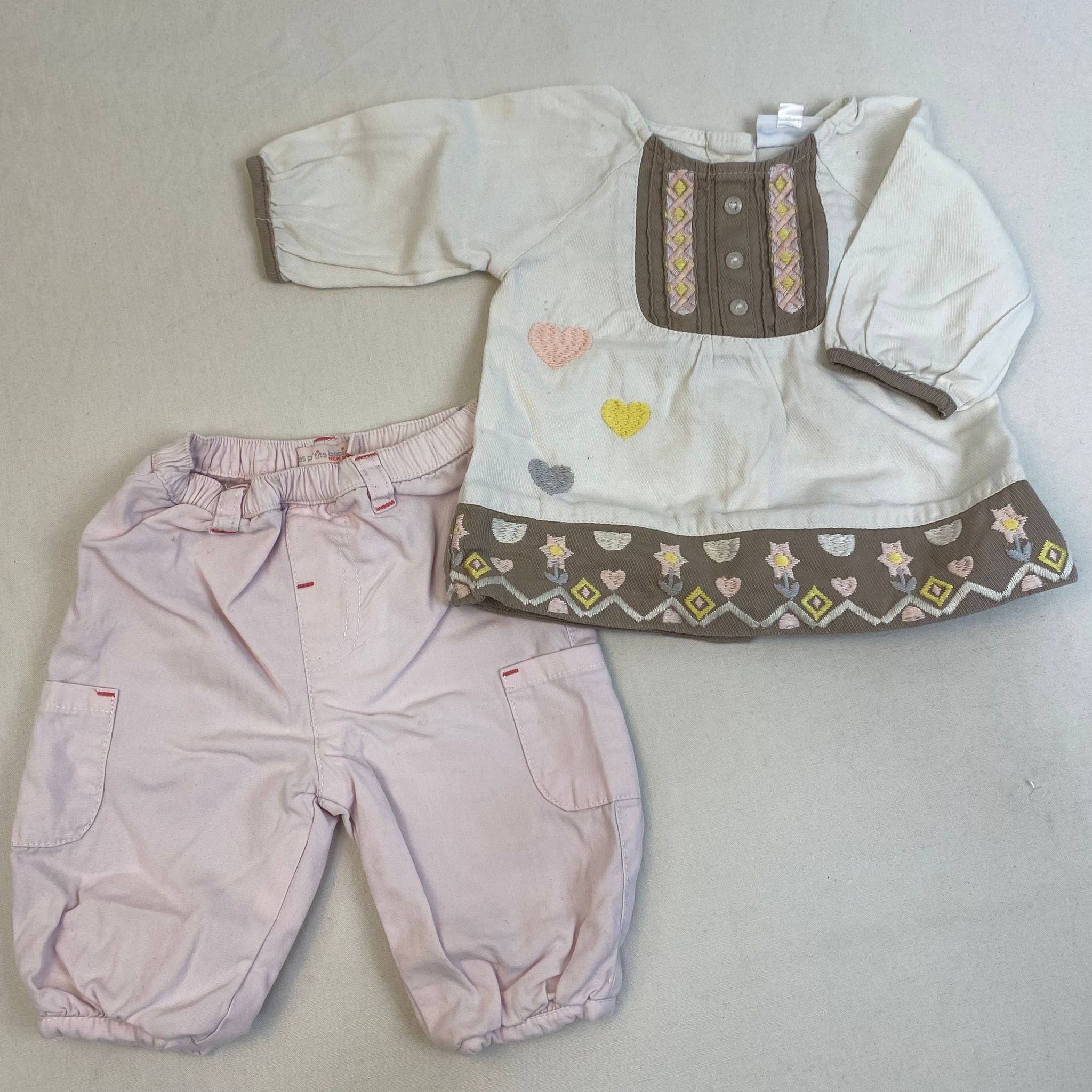 Ensemble 2 pièces : – Blouse manches longues blanche Verbaudet, fermeture au dos par boutons, devant boutons décoratifs, motifs et frises géométriques et floraux rose clair, jaunes et blancs brodés sur un plastron et une bande en bas en tissu beige taupe. – Pantalon uni rose pâle Les P’tits Babies, chevilles et tailles élastiquées, 100% coton.