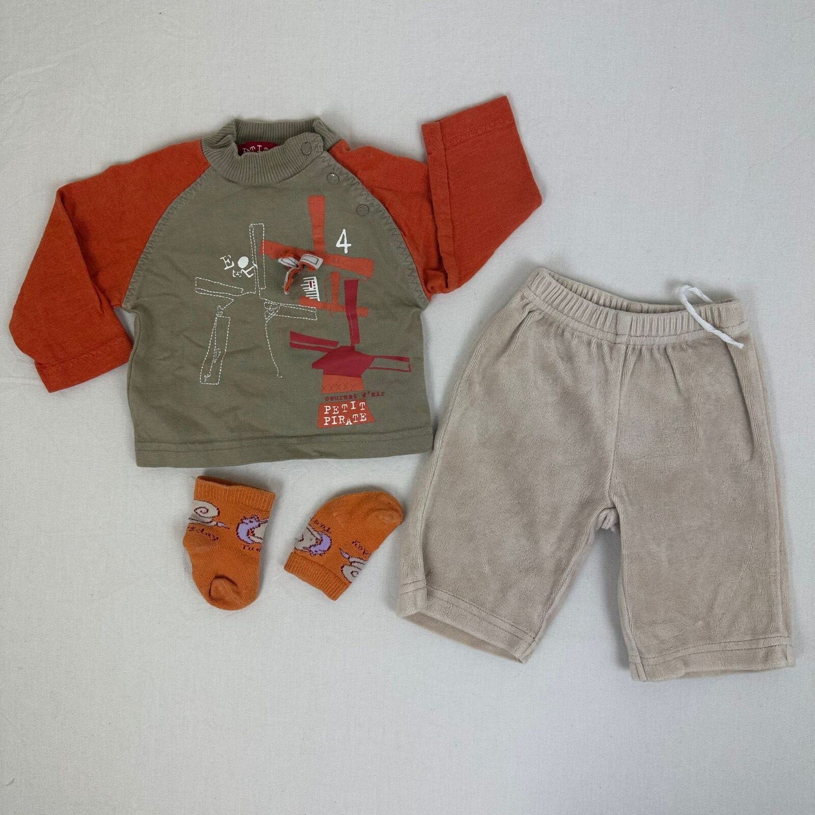 Autres commentaires : T-shirt Petit Pirate manches longues marron avec manches orange et une fermeture devant par boutons pressions. Pantalon sans marque beige en velours avec taille élastiquée.