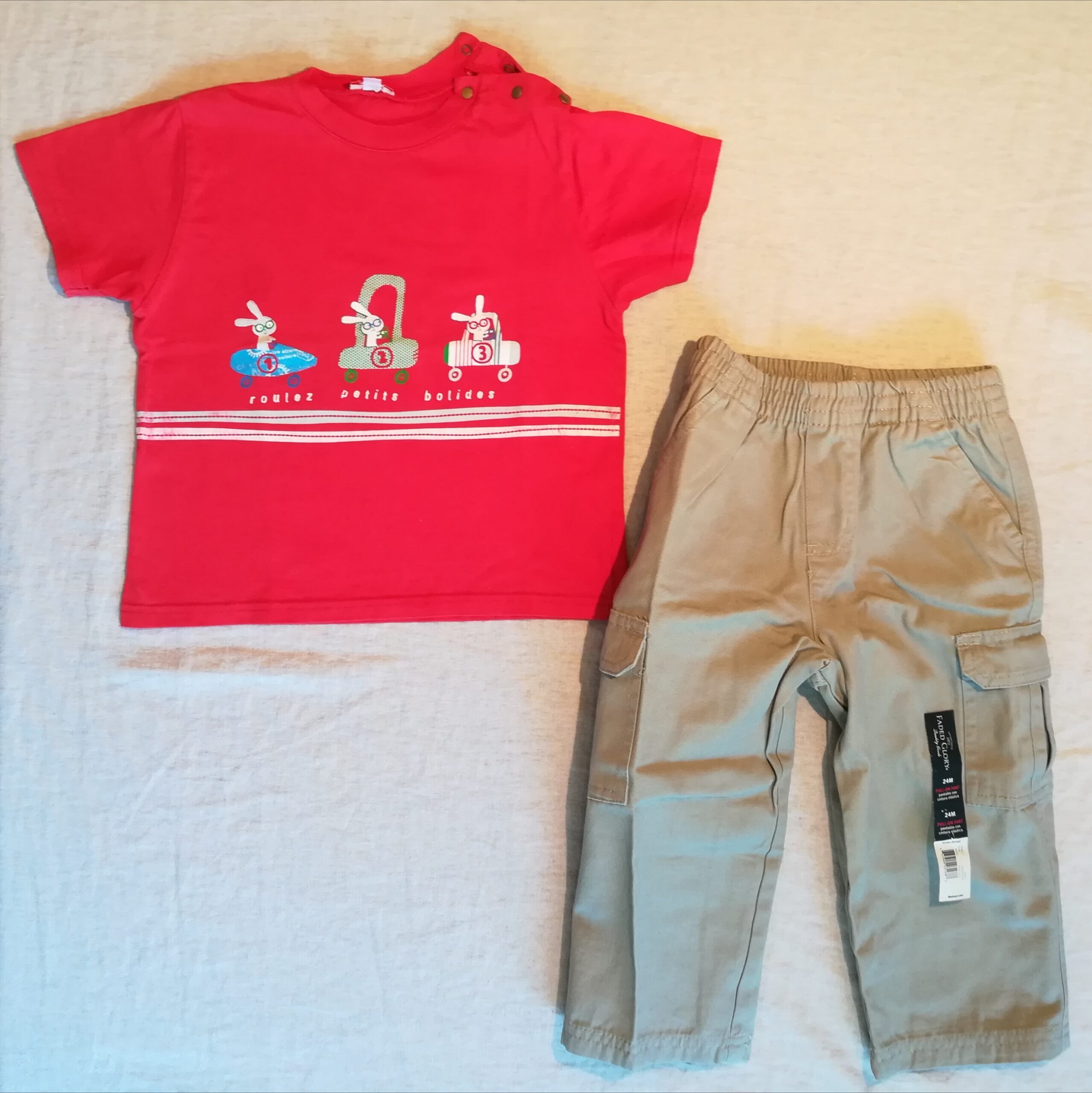 Autres commentaires : T-shirt Catimini, petit défaut, un reste de tâche au dessus du lapin de gauche. Pantalon Faded Glory.