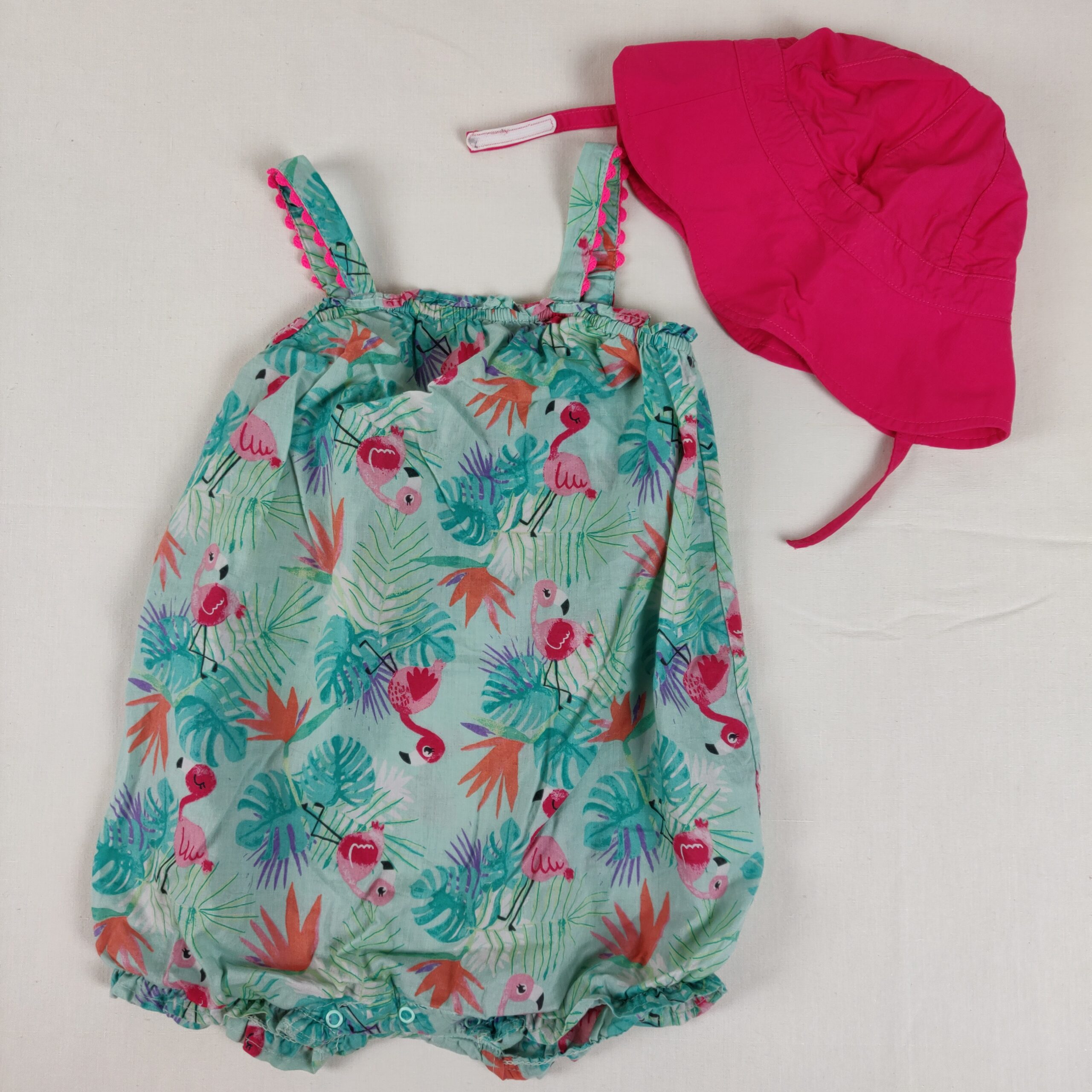 Autres commentaires : Combicourt à bretelles de marque H&M,, style bloomer, avec ouverture par boutons pression à l’entrejambe, de couleur vert d’eau avec motif flamant rose et feuillage exotique, assorti à un chapeau de couleur rose fushia éanti UV (UPF 50+) de la marque Decathlon avec lanière de maintien sous le cou, avec scratch.