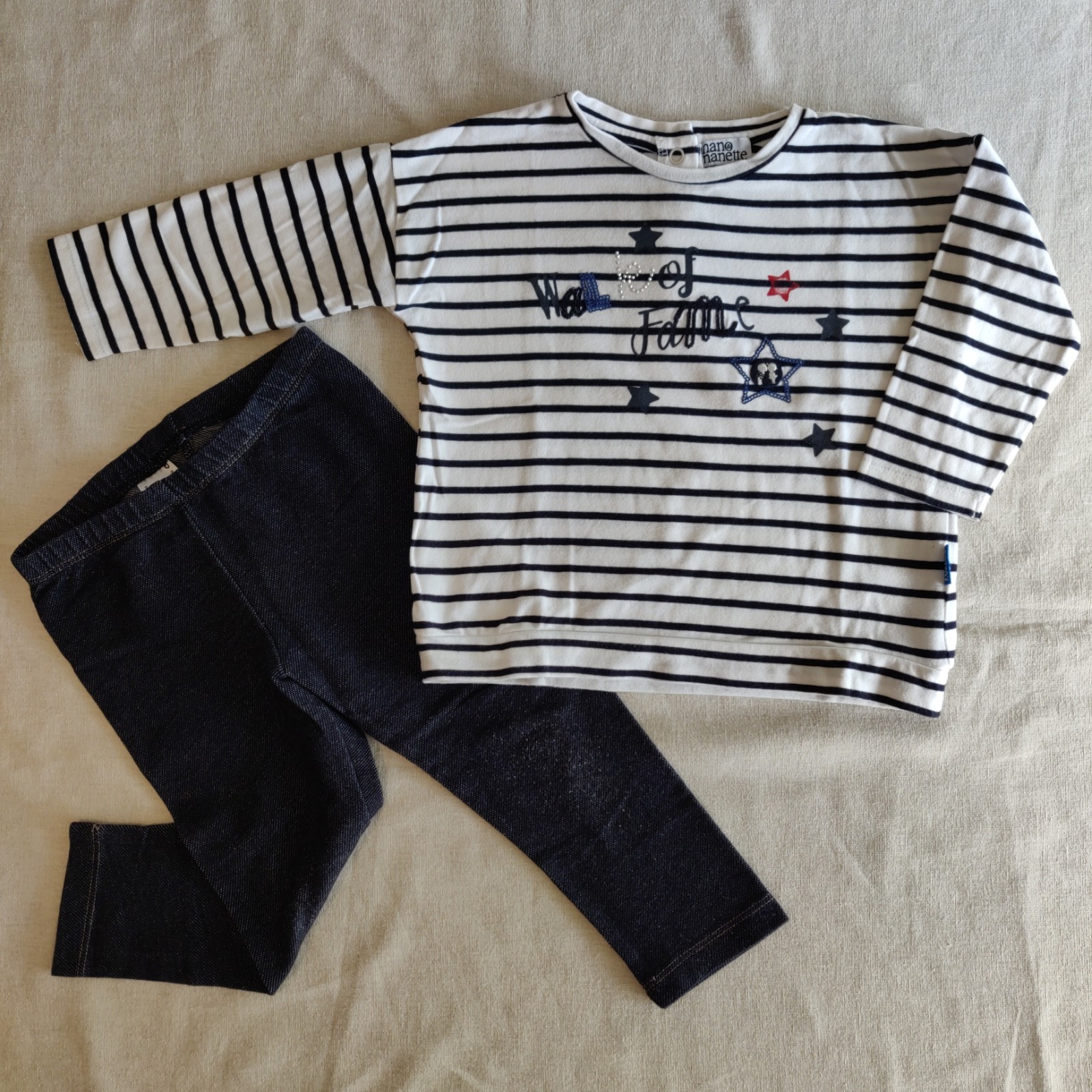Autres commentaires : T-shirt marinière manches longues Nano & Nanette taille 18M très grand, inscription « Wall of Fame » et étoiles à strass, fermeture arrière par 3 boutons pression. Leggings façon denim Circo 2A