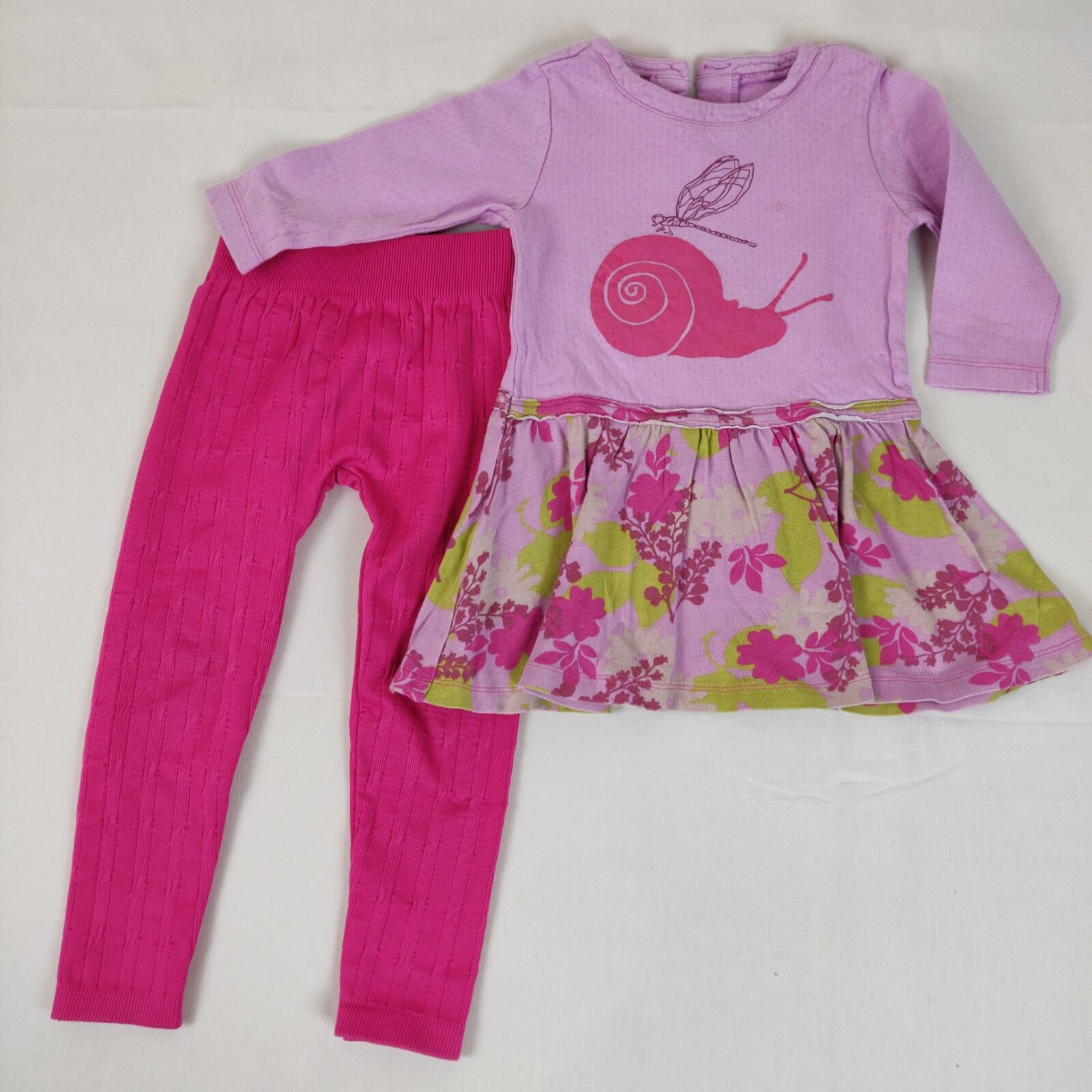 Autres commentaires : Ensemble 2 pièces. Robe à manches longues Baby Lulu – parme. Motif central escargot rose et libellule marron. La jupe présente des motifs floraux mutlicolores. Ouverture centrale au dos à boutons. Collants Hello kitty sans pied – rose fuschia. Taille élastique.