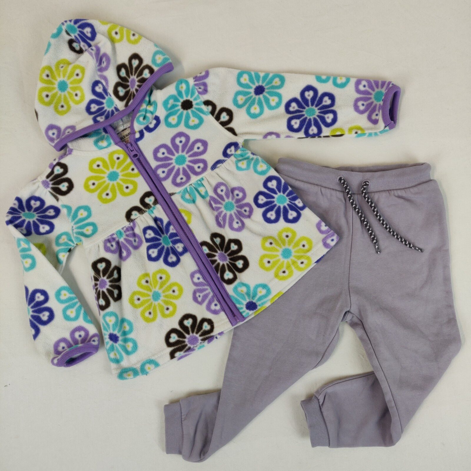 Autres commentaires : Gilet à capuche en polaire Old Navy, contient 100% de polyester et une fermeture zip . Bas de jogging violet contient 20% de polyester.