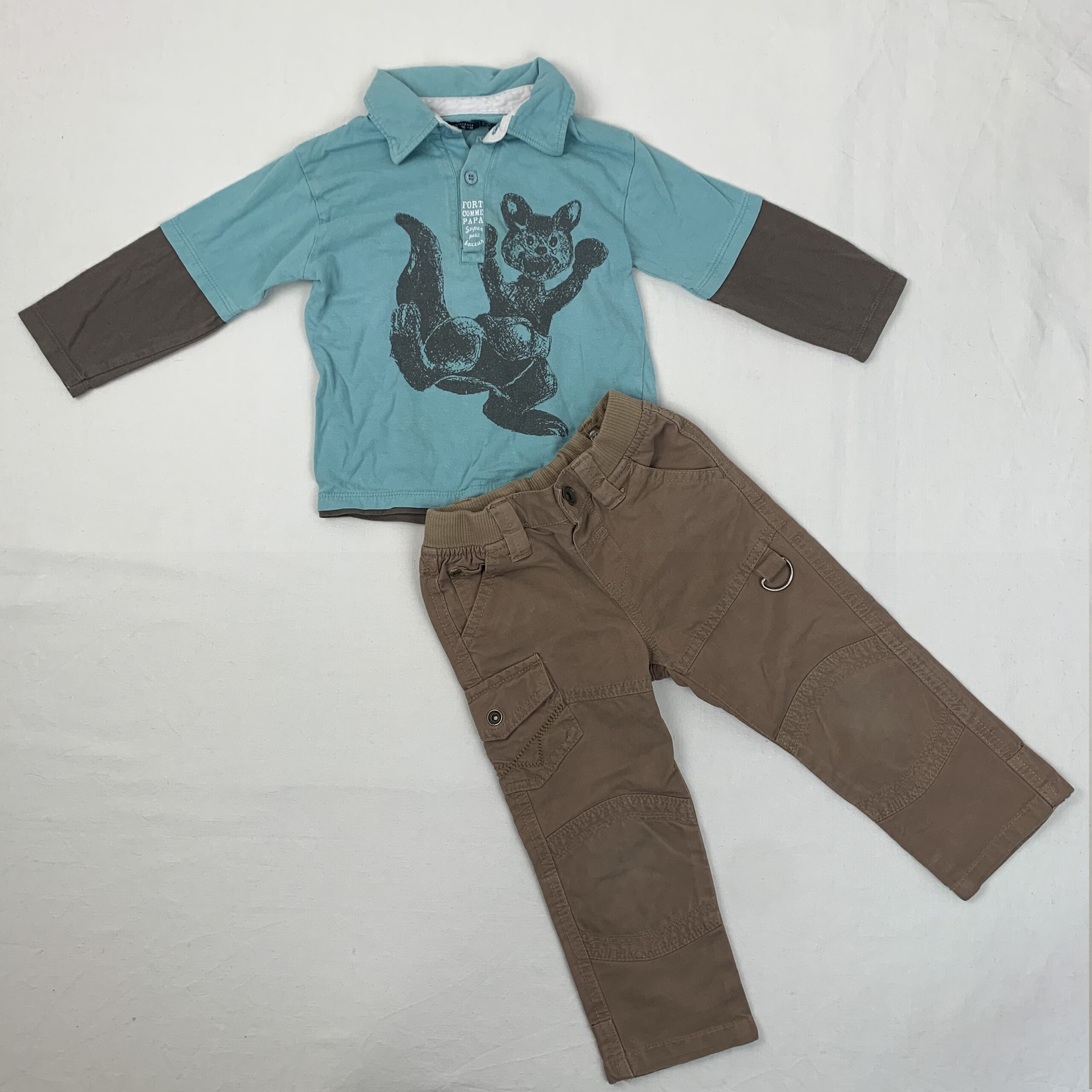 Autres commentaires : Ensemble 2 pièces : – un polo manches longues Tout compte Fait bleu et marron avec dessin de kangourou à l’avant, avec col et boutons de fermeture – un pantalon Verbaudet marron, taille élastiquée réglable, fermeture par boutons pression.