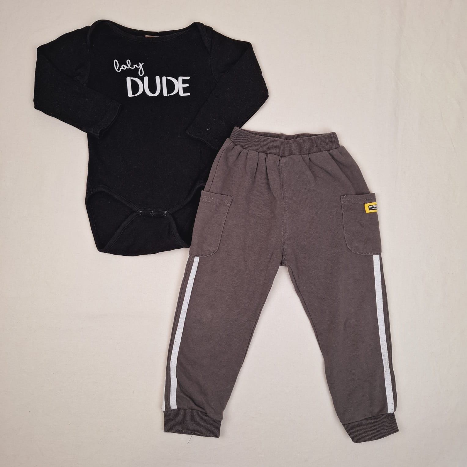 Autres commentaires : Ensemble 2 pièces 24M composé d’un body noir avec inscription « baby dude » en blanc manches longues et fermetures boutons pressions en bas et pantalon gris foncé taille et cheville élastiquée bandes blanches sur les côtés et étiquettes jaune sur la poches avec inscritption » DESIGNER Fashion »