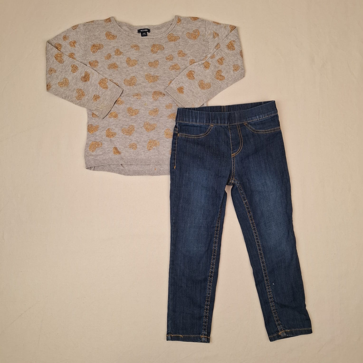 Autres commentaires : Ensemble 2 pièces : – Pull gris en maille Kiabi, parsemé de coeurs en fil doré, col arrondi, poignets et bas côtelés, petits boutons pailletés décoratifs au dos, 100% coton. – Leggings en jean bleu foncé H&M, taille élastiquée, 52% coton, 26% polyester, 20% viscose et 2%. élasthanne.