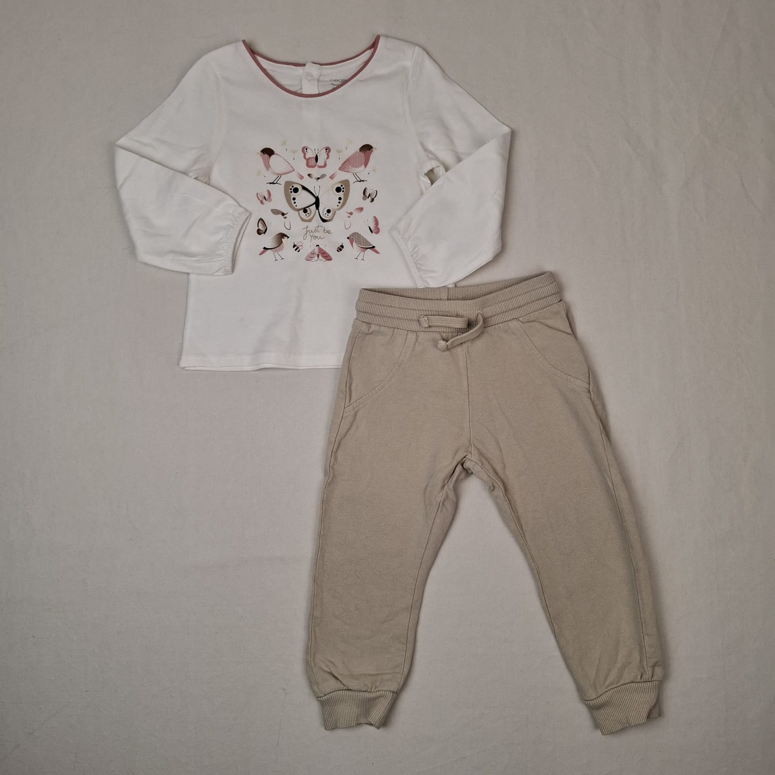 Autres commentaires : Ensemble 2 pièces : – T-shirt blanc à manches longues, motif d’oiseaux et de papillons, col rond, fermeture par boutons pression au dos, poignets élastiques. -Pantalon de jogging beige Hoodadoo, large taille élastique avec lacets.