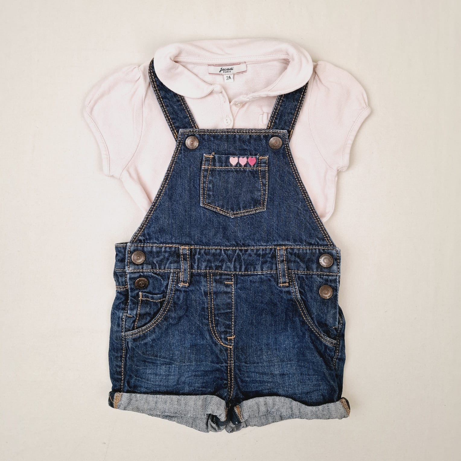 Autres commentaires : Ensemble 2 pièces : – Salopette short Kiabi en jean bleu foncé, ceinture ajustable par élastique intérieur, revers au niveau des cuisses, fermeture latérale et des bretelles par boutons pression, 100% coton avec doublure bleu marine à pois gris mauve en 80% polyester et 20% coton. – OFFERT : polo manches courtes Jacadi rose pâle avec manches ballon, 100% coton. Petit défaut : quelques éclaboussures devant.