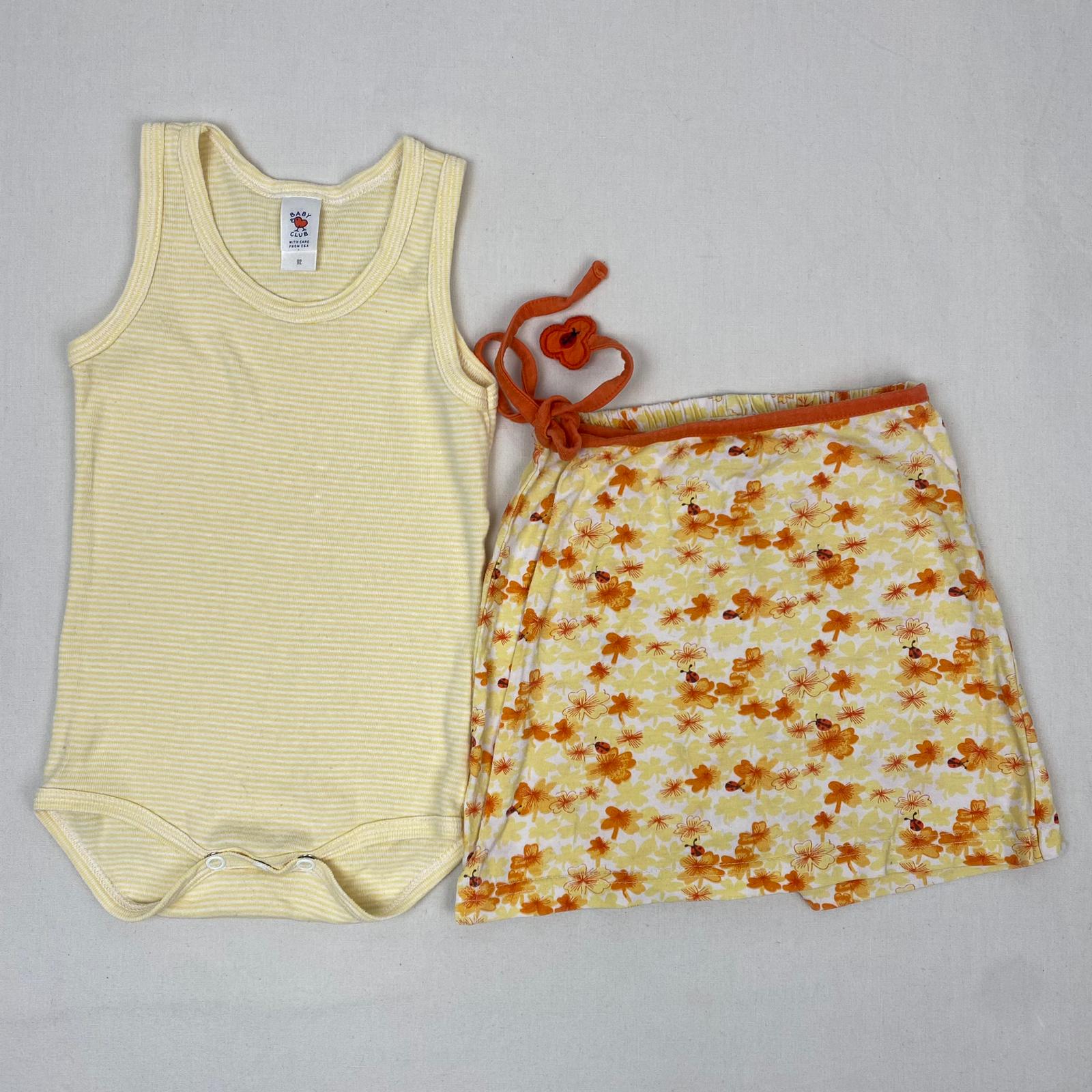 Autres commentaires : Ensemble 2 pièces : Body Baby Club jaune à rayures blanches sans manches. – Short jaune DPAM avec des motifs de fleurs oranges, fermeture par lanières.