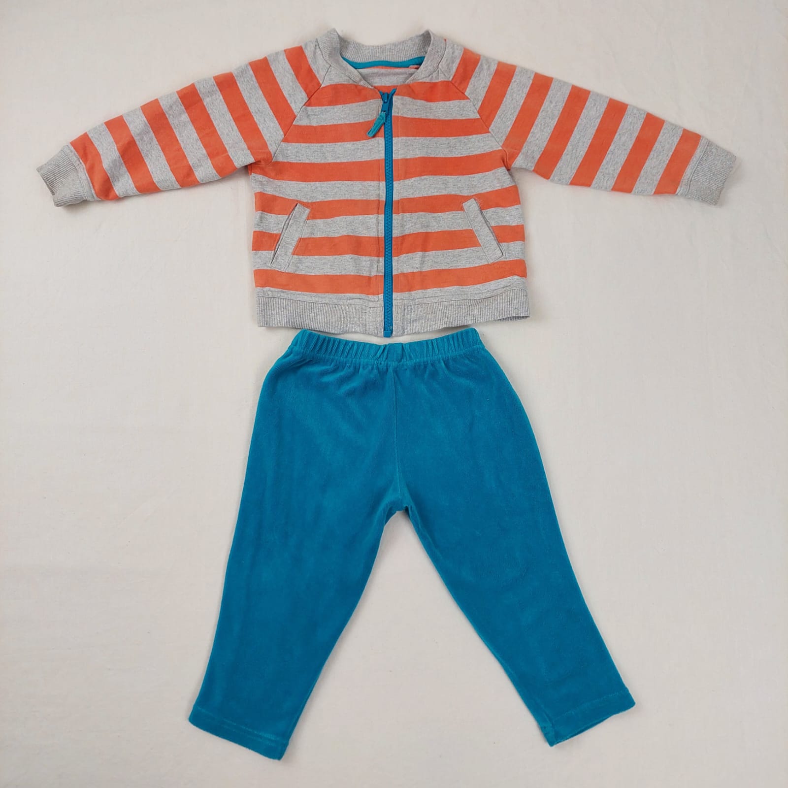 Autres commentaires : Gilet zip 100% coton, rayé gris et orange, petite tache discrète sur la mance droite, bas de pyjama bleu 100% polyester