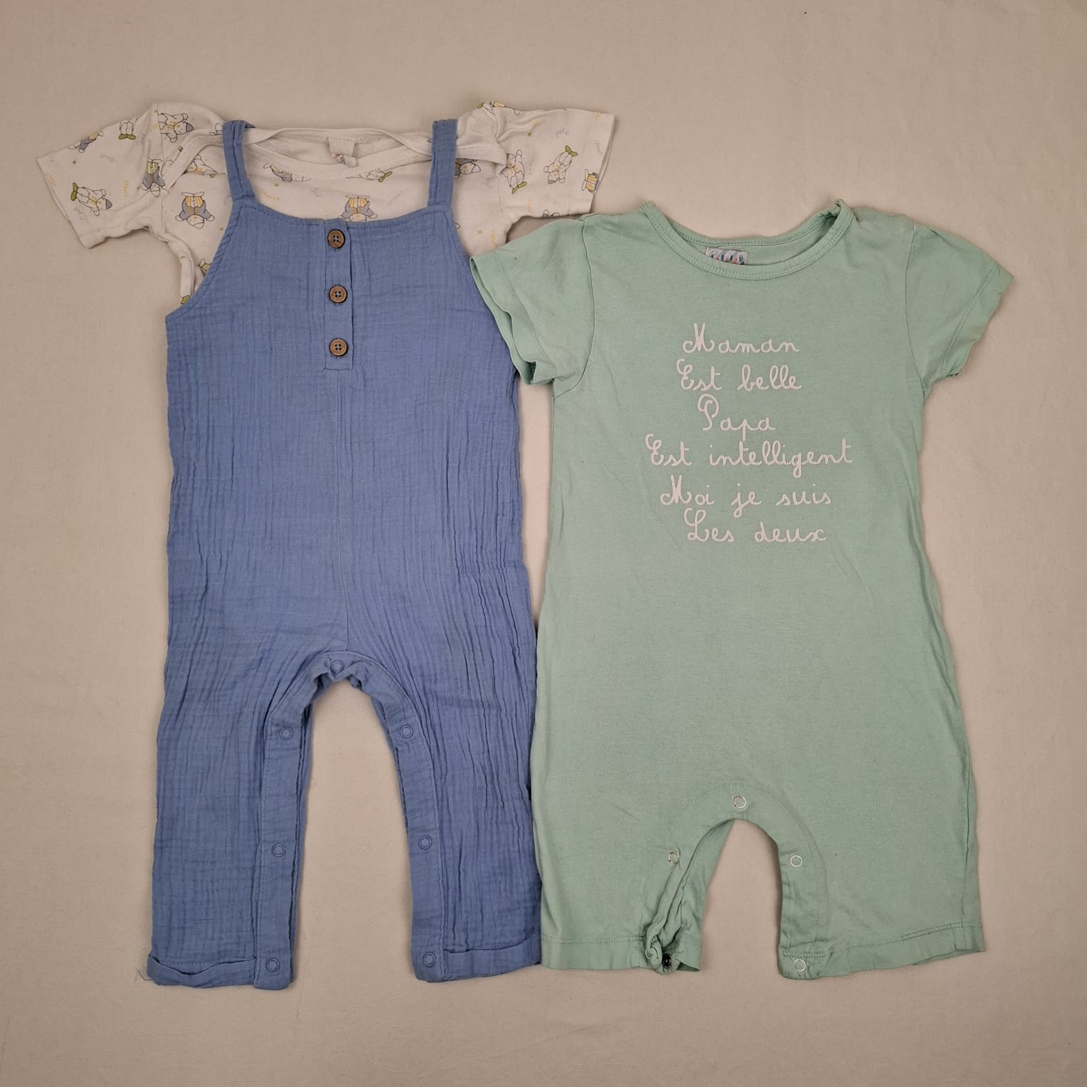 Autres commentaires : Lot de 2 combinaisons : – une combi longue à bretelles Primark, en tissu aspect gaufré de couleur bleu lavande fermeture devant par boutons et à l’entrejamb par boutons pression, revers aux chevilles, 100% coton. Taille 18M mais estimée à 2 ans. OFFERT : Body manches courtes Absorba, vintage, blanc parsemé de clowns blancs. – une combi courte à manches courtes Babilou, vert d’eau, inscription « Maman est belle. Papa est intelligent. Moi je suis les deux. », fermeture à l’épaule et à l’entrejambe par boutons pression.