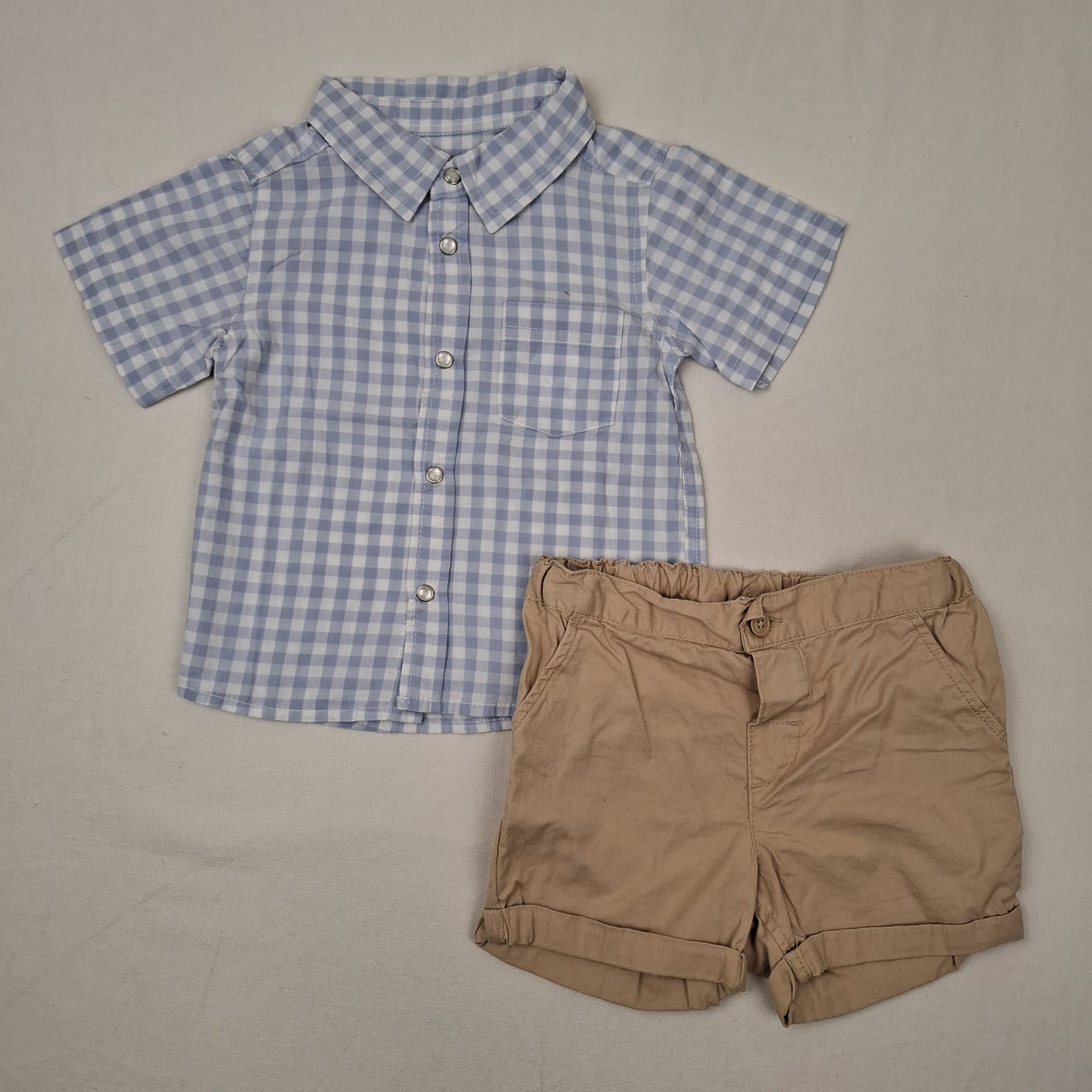 Autres commentaires : Ensemble 2 pièces : – Chemise manches courtes Mots d’enfant, blanche à carreaux Vichy couleur Lilas, fermeture devant par boutons pression. – Short en toile couleur sable H&M, revers aux cuisses, fermeture devant par bouton, taille ajustable par élastique intérieur.