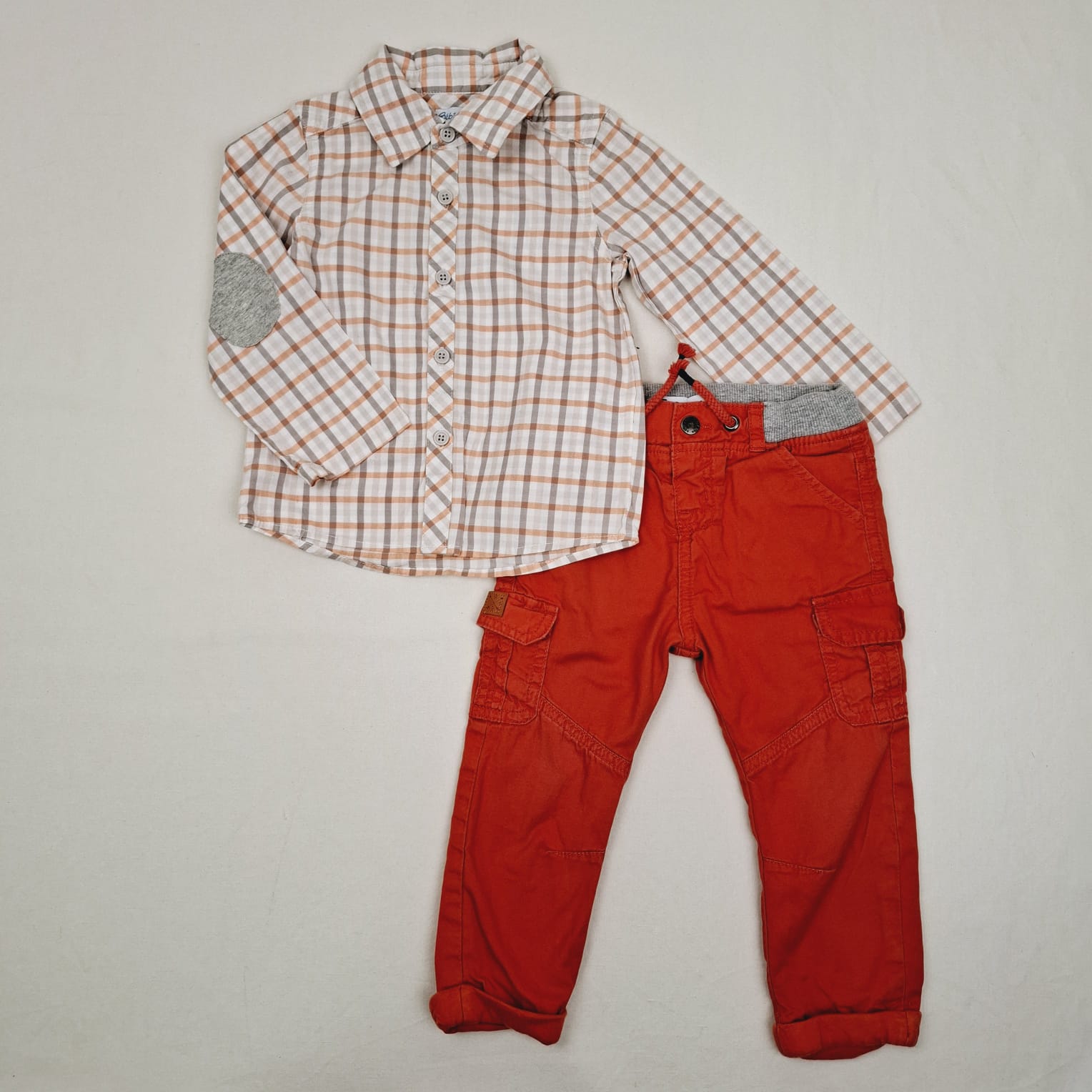 Autres commentaires : 10% viscose, 5% élasthanne. Ensemble 2 pièces : – Chemise à manches longues Bébérêveblanc cassé à carreaux orange et grises, fermeture devant par boutons. – Pantalon cargo orange brique Gémo, fermeture devant par boutons, taille élastiquée.