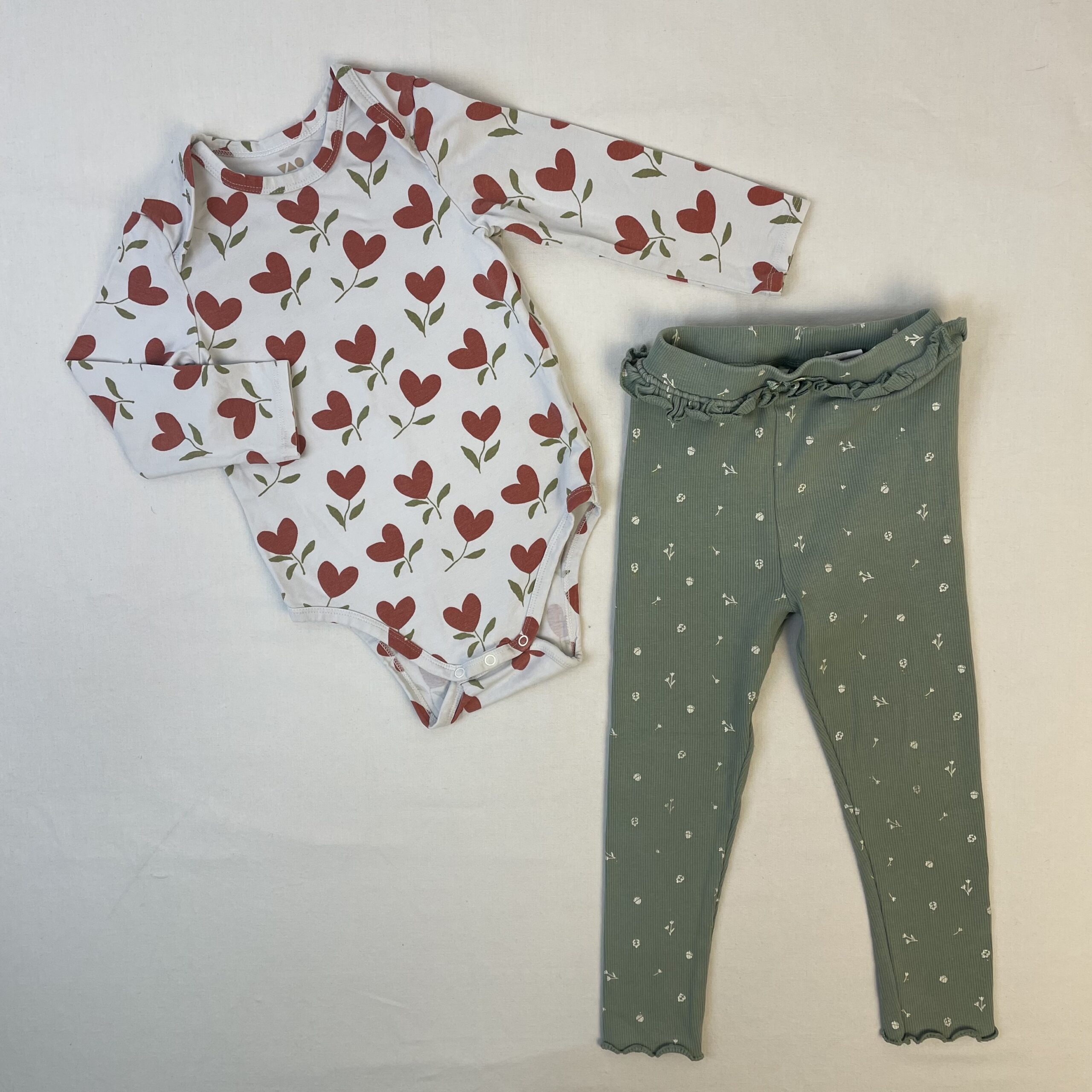 - leggings vert étiqueté en 36 mois mais taille effectif 2A, motif de plantes imprimés