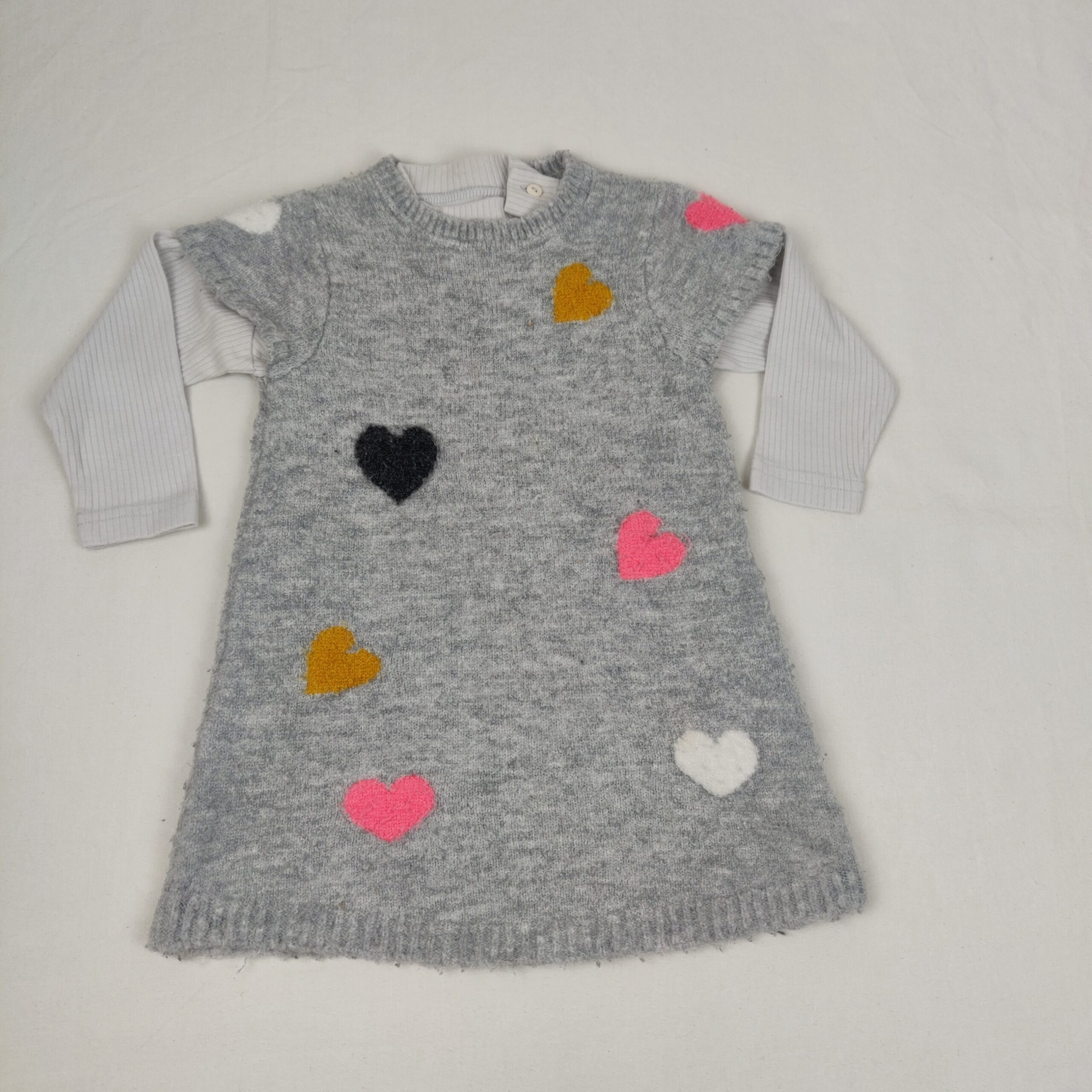 Autres commentaires : Ensemble 2 pièces dont – 1 robe pull Orchestra grise en lainage, à manches courtes, avec coeurs multicolores en relief, ouverture en haut du dos par boutons classiques, 78% acrylique, 21% polyester, 1% élasthanne) (un peu de boulouches d’usure) – 1 sous-pull blanc mastic Marèse, cotélé, à manches longues, col cheminée, ouverture avec boutons classiques à gauche du col, 100% coton.
