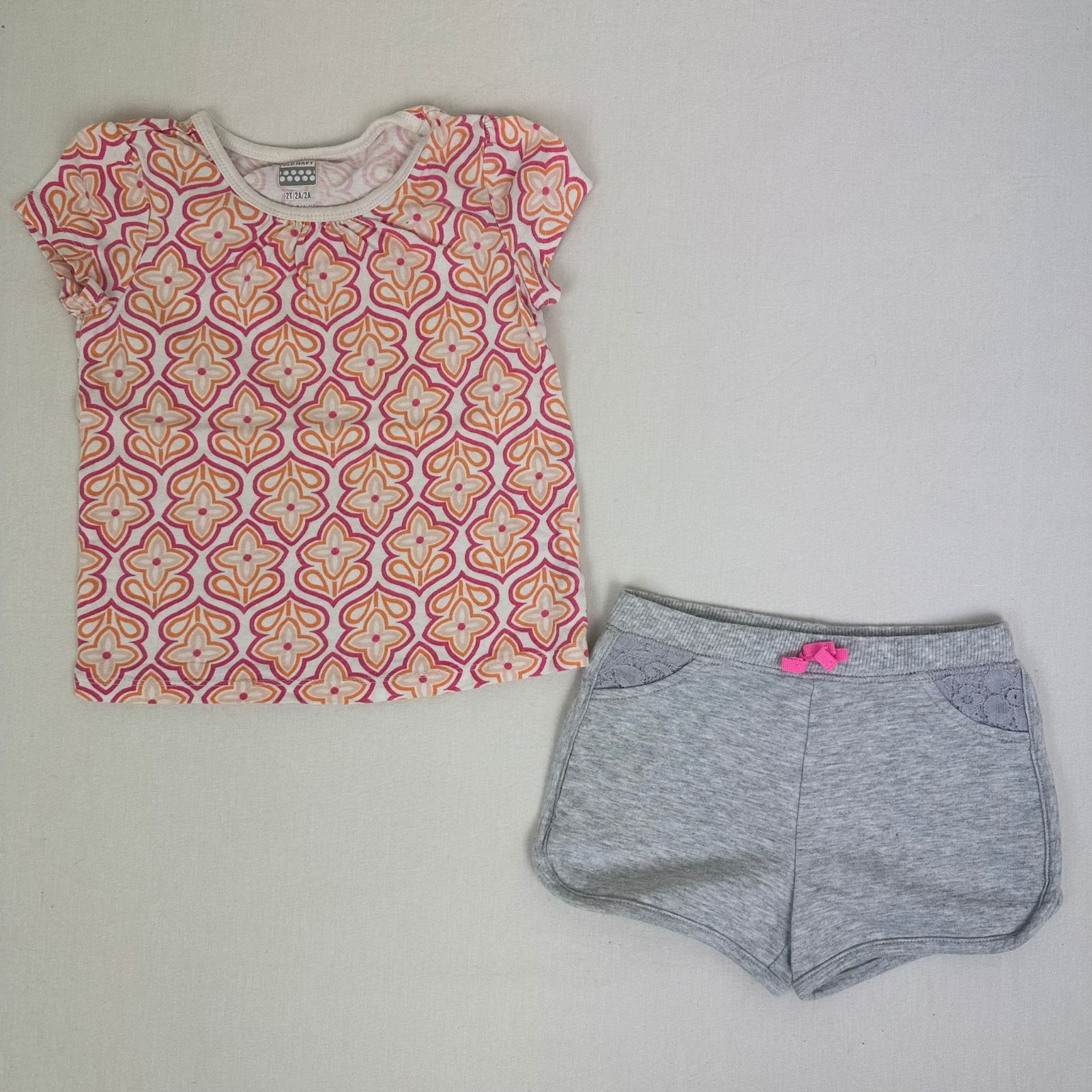 Autres commentaires : T-shirt Old Navy manches courtes rose et orange avec motif fleurale. Short gris Jumping Beans avec taille élastiquée.